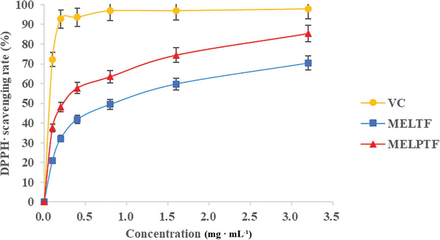 DPPH-scavenging activities of MELTF and MELPTF. DPPH, 1,1-diphenyl-2-picrylhdrazyl; MELTF, M. exotica leaves total flavonoids; MELPTF, MELTF after purification; VC, vitamin C.