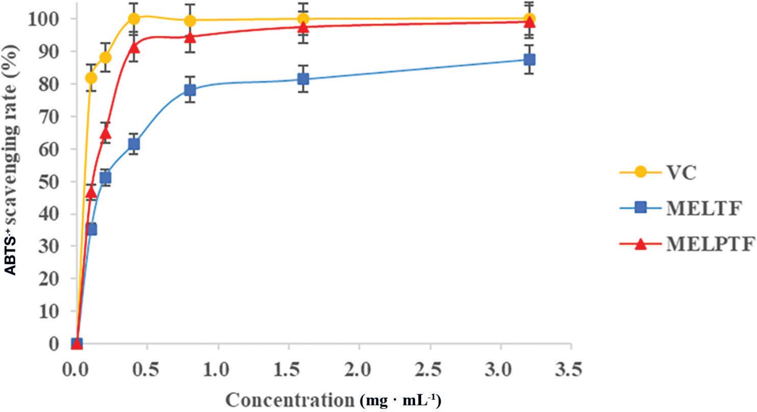 ABTS·+ scavenging activities of MELTF and MELPTF. ABTS, 2,2′-Azino-bis (3-ethylbenzthiazoline-6-sulphonic acid); MELTF, M. exotica leaves total flavonoids; MELPTF, MELTF after purification; VC, vitamin C.