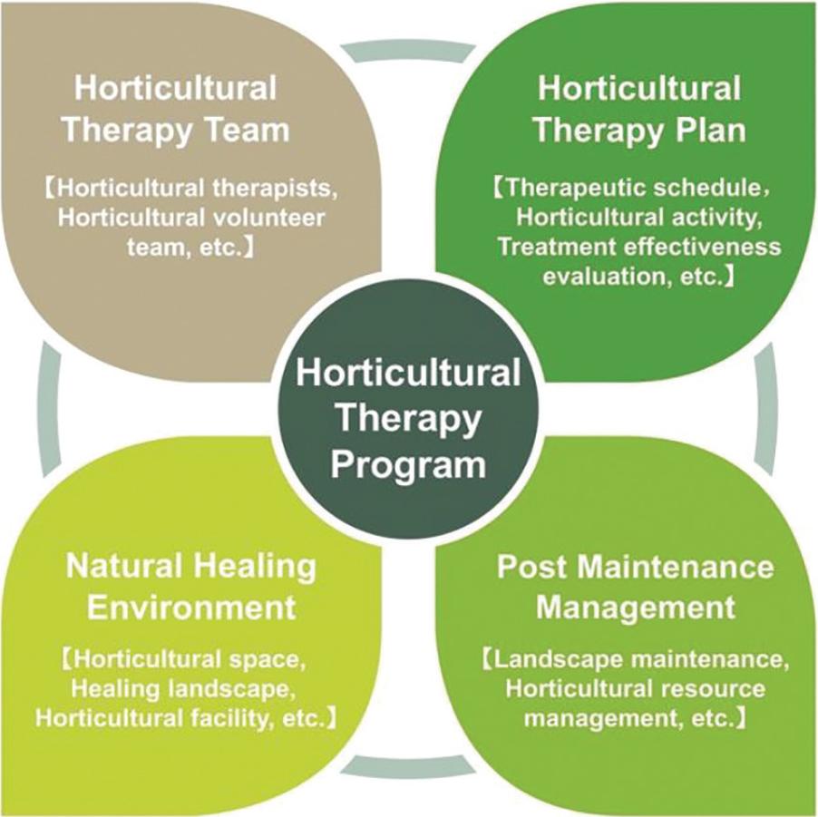 Nevertheless, implementation of the horticultural therapy programme is not a straightforward process. Rather, it is a comprehensive system that includes numerous elements, such as horticultural activity settings, horticultural site planning and treatment plan formulation (Kam and Siu, 2010; Adevi and Mårtensson, 2013; Tu et al., 2020), as can be seen from the definition of horticultural therapy and related research. Because the word ‘horticultural therapy’ is a compound of the Latin word hortus (garden) and the Greek word therapeuein (treatment, care), Rogatka and Ziemkiewicz (2020) proposed that the definition of this term might be ‘treatment by use of a garden’. The American Horticultural Therapy Association (AHTA) defines horticultural therapy as the participation in horticultural activities facilitated by a horticultural therapist-registered (HTR) to achieve specific goals within an established treatment, rehabilitation or vocational plan. The rise of horticultural therapy in China began around 2000, with representative scholars such as Li (2000) from Tsinghua University. Li (2000) defines horticultural therapy as an effective method of maintaining and restoring people’s physical and mental functions, and improving the quality of life through plants, plant growth environment and various activities related to plants. Relying on the landscape of a university campus, He (2020) conducted an empirical study related to horticultural therapy, and she concluded that maintenance is an integral and important part of the construction of horticultural therapy on campus, and a necessary step for horticultural therapy to work sustainably in the campus landscape. Davis (2011) believed that in order to preserve and enhance the functionality of a horticultural therapy programme, post-maintenance is necessary and can be undertaken by designers and horticultural therapists.
