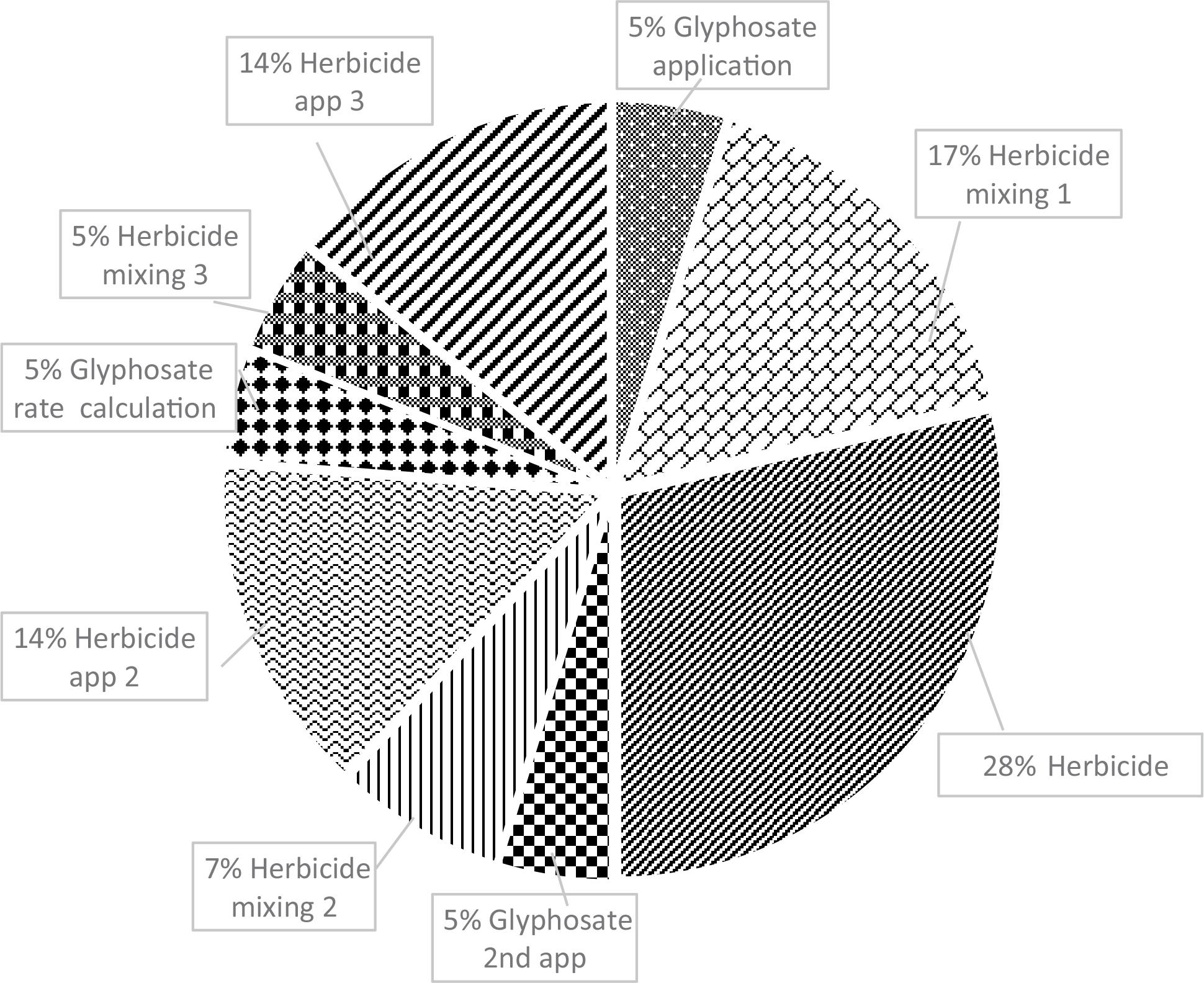 Time spent on tasks required in Scenario 2 ‘no-till and glyphosate treatment’. Notes: A total time of all tasks is 3 hr and 30 min. Glyphosate rates were calculated using Excel on a cell phone; herbicide was measured using graduated cylinder and water in a back sprayer, which was used to apply the mix.