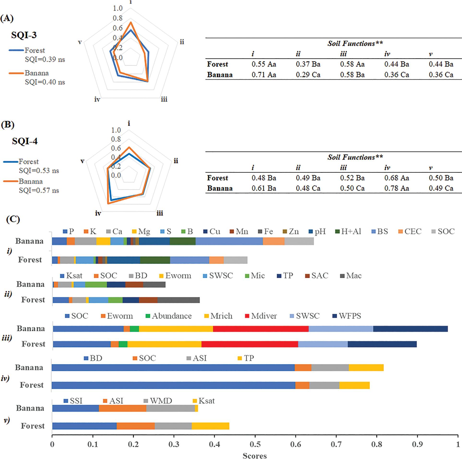 Mean values of the Forest and Banana systems for SQIs, considering the TDS, linearly interpreted, with integration weighted and additive, respectively, for SQI-3 (A) and SQI-4 (B) and contribution of soil functions in each one. Contribution of the soil indicators§ in the respective score functions (C) linear. ns: non-significant; *non-significant interaction; simple effects evaluated; **significant interaction; means followed by the same uppercase letter between functions and lowercase between systems do not differ by Tukey’s test (p < 0.05); i–availability and nutrient cycling; ii–availability of water and soil aeration; iii–support to biological activity; iv-sustaining plant growth; v-ability to resist degradation. ASI, aggregate stability index; BD, bulk density; BS, base saturation; CEC, electrical conductivity; SAC, soil aeration capacity; SOC, soil organic carbon; SQIs, soil quality indexes, SSI, structural quality index; SWSC, soil water storage capacity; TDS, total dataset; TP, total porosity; WFPS, water filled pore space; WMD, weighted mean diameter.