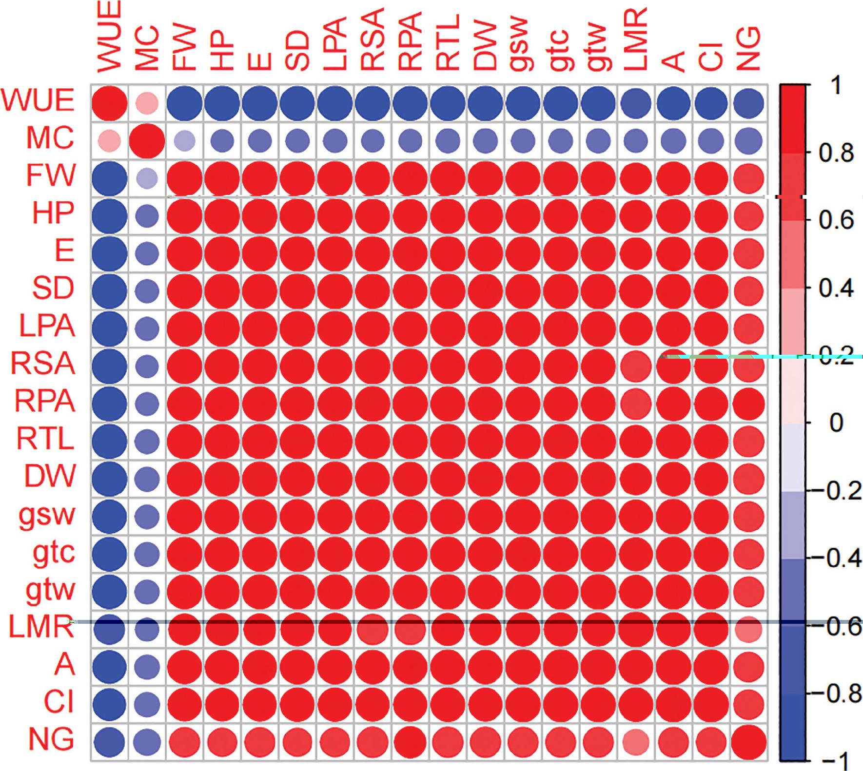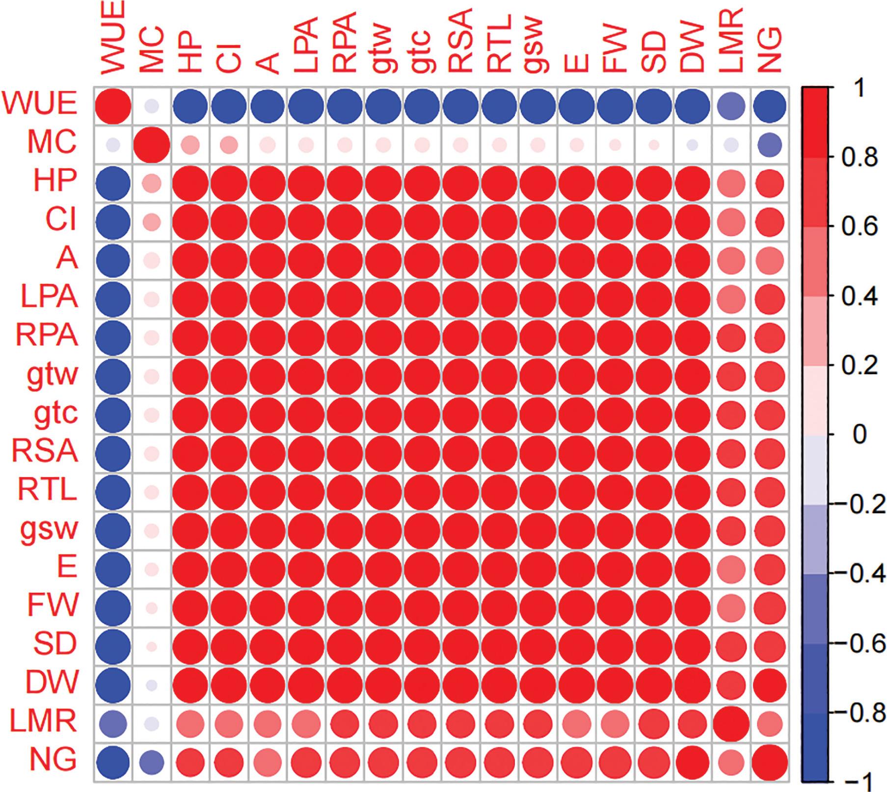 The correlation coefficient of okra plant treated with TNPs under water stress. A, photosynthetic rate; Ci, intercellular CO2 concentration; DW, dry weight of each plant; E, transpiration rate; FW, fresh weight of each plant; gsw, stomatal conductance to water vapour; gtc, total conductivity to CO2; gtw, total conductivity to water vapour; HP, height of plant; LPA, leaf projected area; MC, moisture content; NPs, nanoparticles; RPA, root projected area; RSA, root surface area; RTL, root total length; SD, stem diameter; TNPs, titanium dioxide nanoparticles; WUE, water use efficiency.