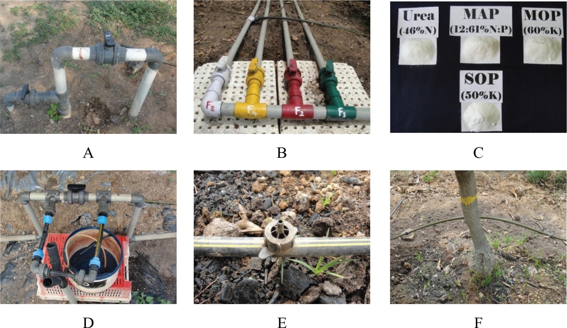 View of fertigation equipment. (A) Main line. (B) Sub-line showing different fertigation levels. (C) Water-soluble fertilisers used for fertigation. (D) Fertigation on run. (E) On-line emitters. (F) Drippers in use discharging water.