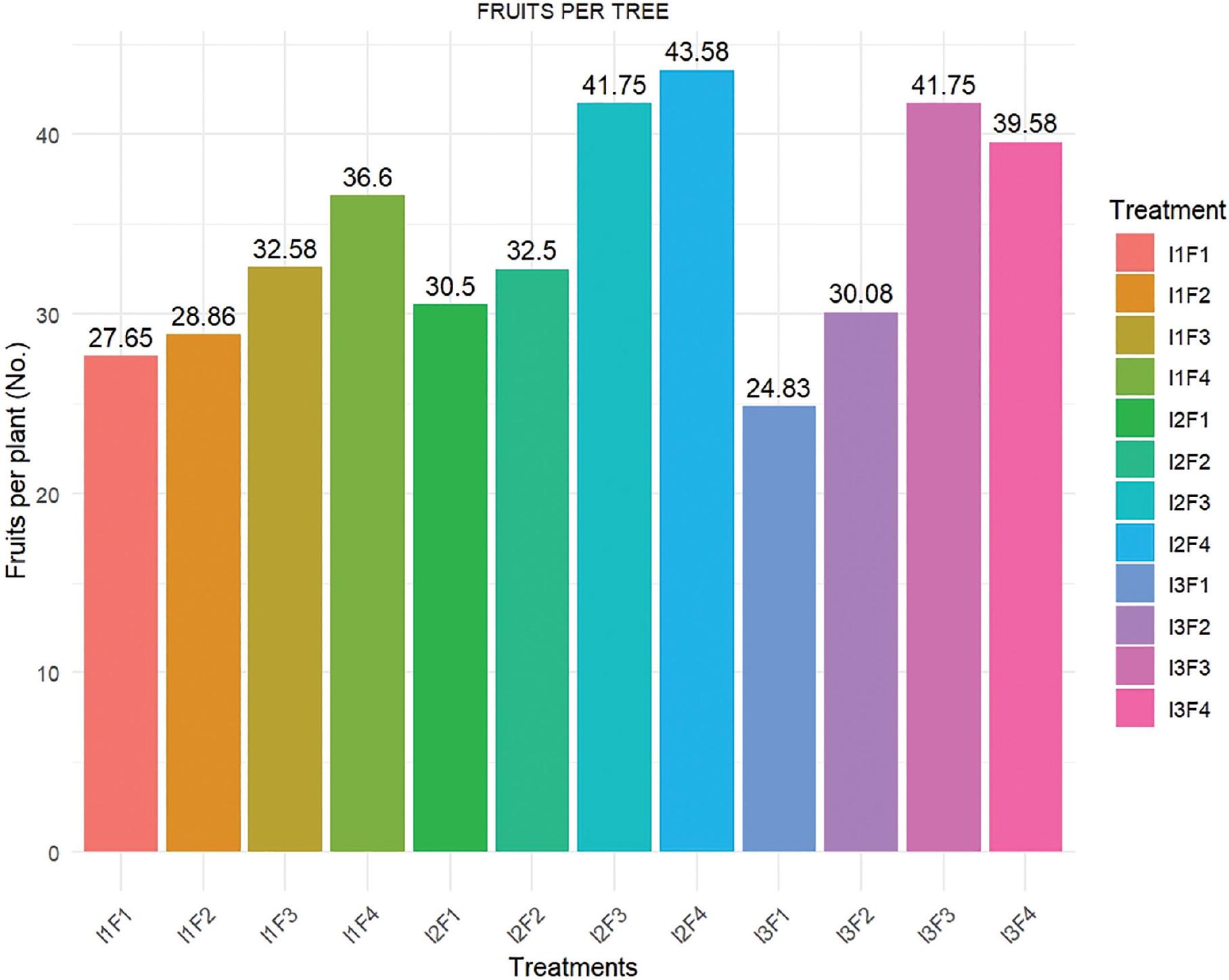 Fruits produced in single tree were significantly affected by treatments and are presented in Figure 6. Among the main plot treatments, I2 (100% Pan evaporation) produced the maximum number of fruits per tree (36.94) which was equivalent to that of I3 (34.06). Among the fertigation levels, F4 (125% fertiliser recommended for mango) produced the maximum number of fruits per tree (39.92) which was equivalent to that of F3 (100% fertiliser recommended for mango; 38.50).