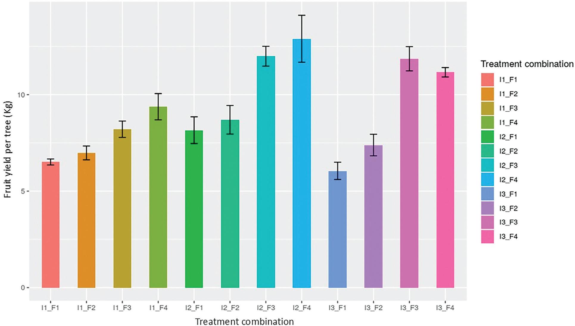 Mango fruit yield was significantly affected by the irrigation, fertigation and its interaction levels (Figures 9, 9A, 9B). Among the main-plot treatments, I2 (100% Pan evaporation) produced the maximum fruit yield per tree (10.44 kg) while among the fertigation levels, F4 (125 % fertiliser recommended for mango) produced the maximum fruit yield (11.14 kg) followed by F3 (100% fertiliser recommended for mango; 10.69 kg); however, they were equivalent to each other. Regarding the effect of interaction, I2F4 (100% Pan evaporation and 125% fertiliser recommended for mango) registered the maximum fruit yield (12.90 kg) followed by I2F3 (100% Pan evaporation and 100% fertiliser recommended for mango; 11.99 kg); however, they were found to be equivalent to each other. Similar results due to better utilisation of nutrients throughout the reproductive cycle of mango, resulting in higher fruit yield, were concluded by Kumar et al. (2008); Sivakumar (2007); Ramana et al. (2022); Parthiban et al. (2020).