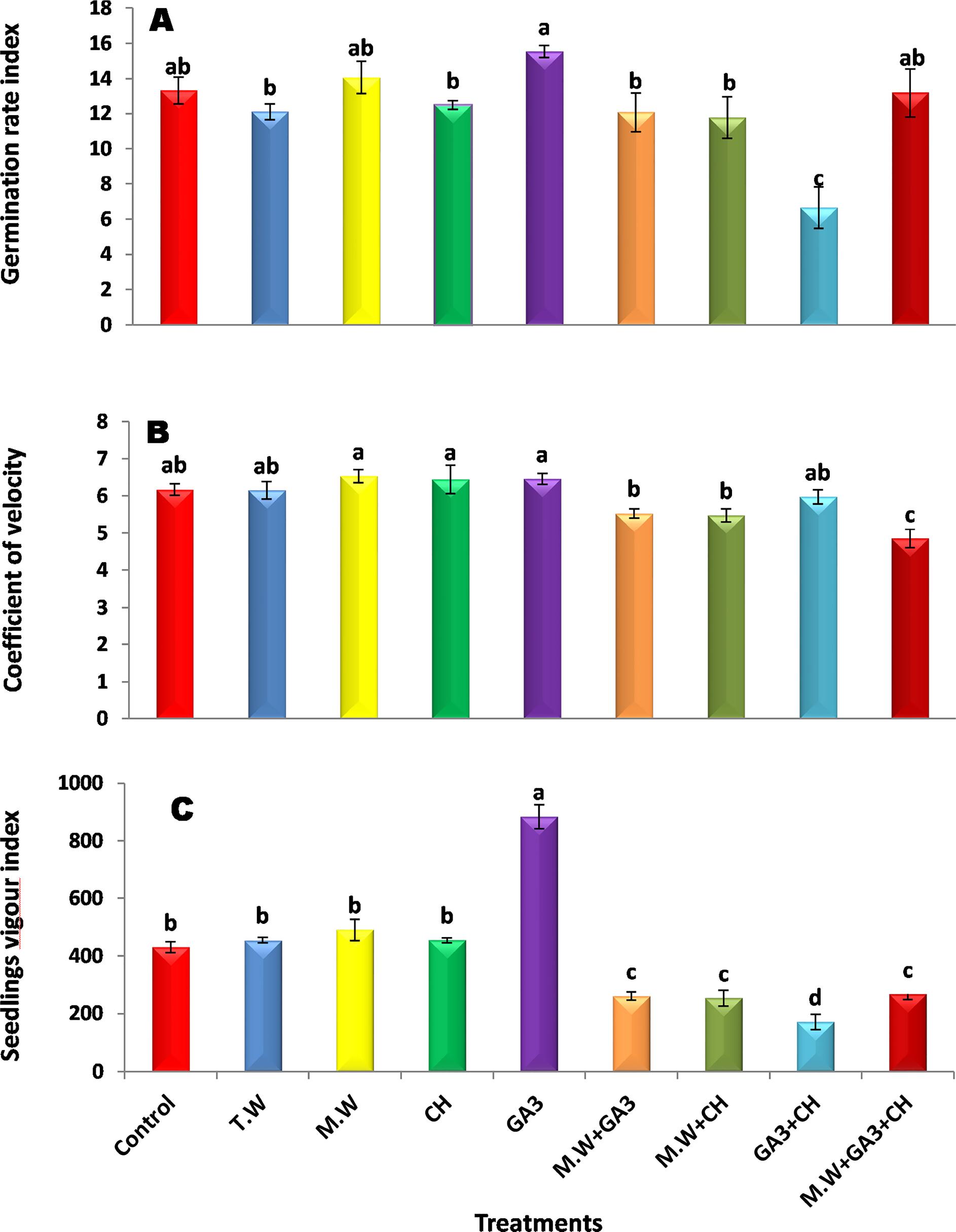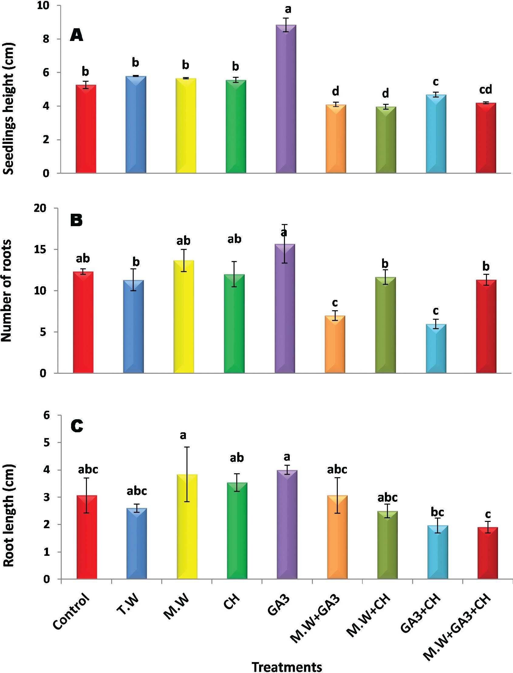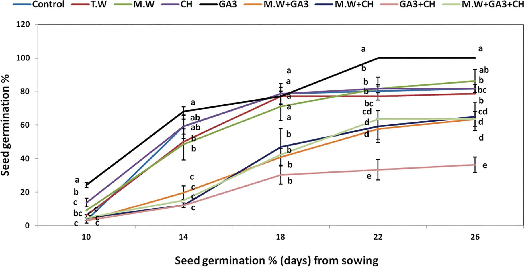 | Treatments | Control | T.W | M.W | CH | GA3 | M.W + GA3 | GA3 + CH | M.W + CH | M.W + GA3 + CH |