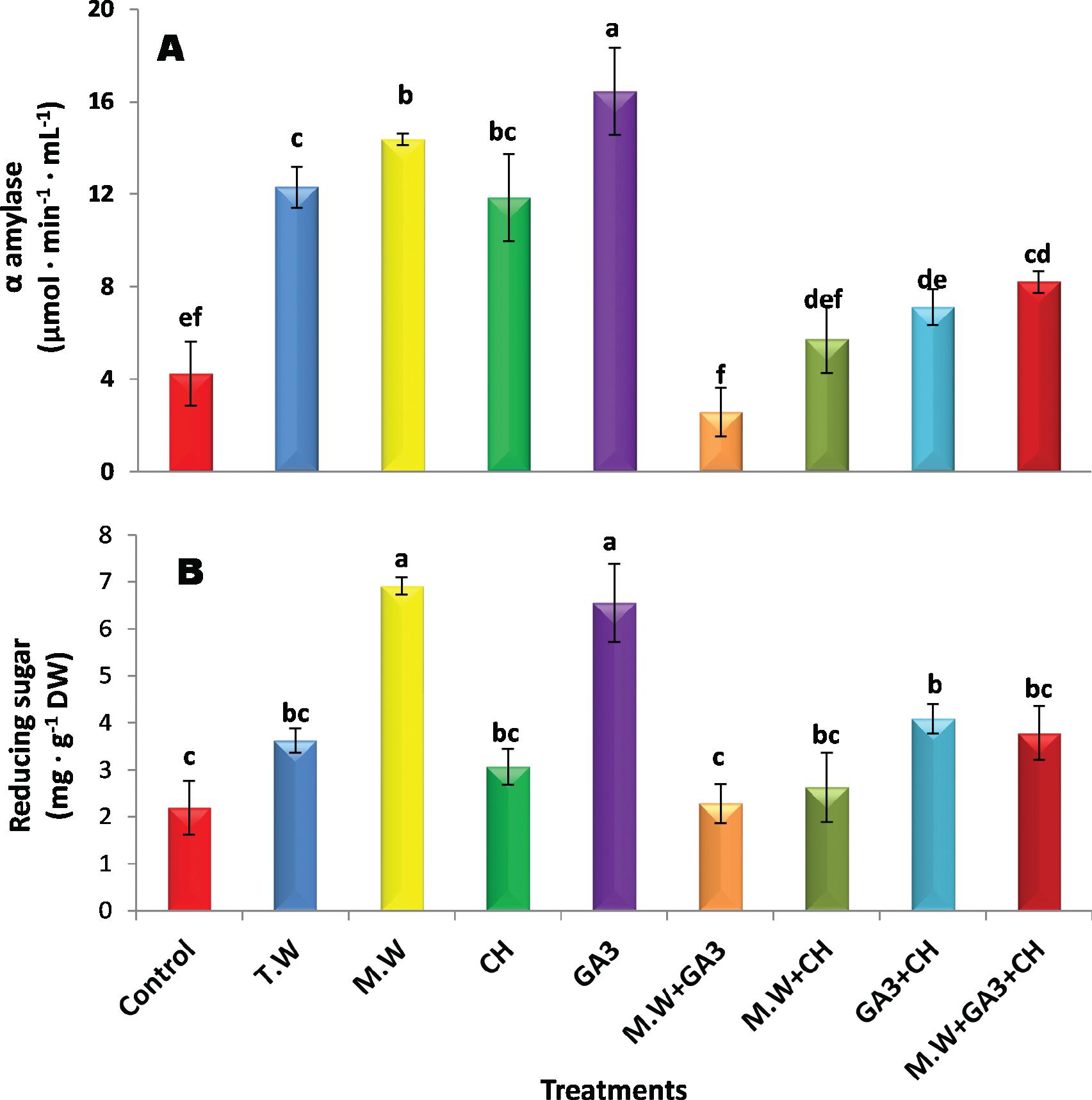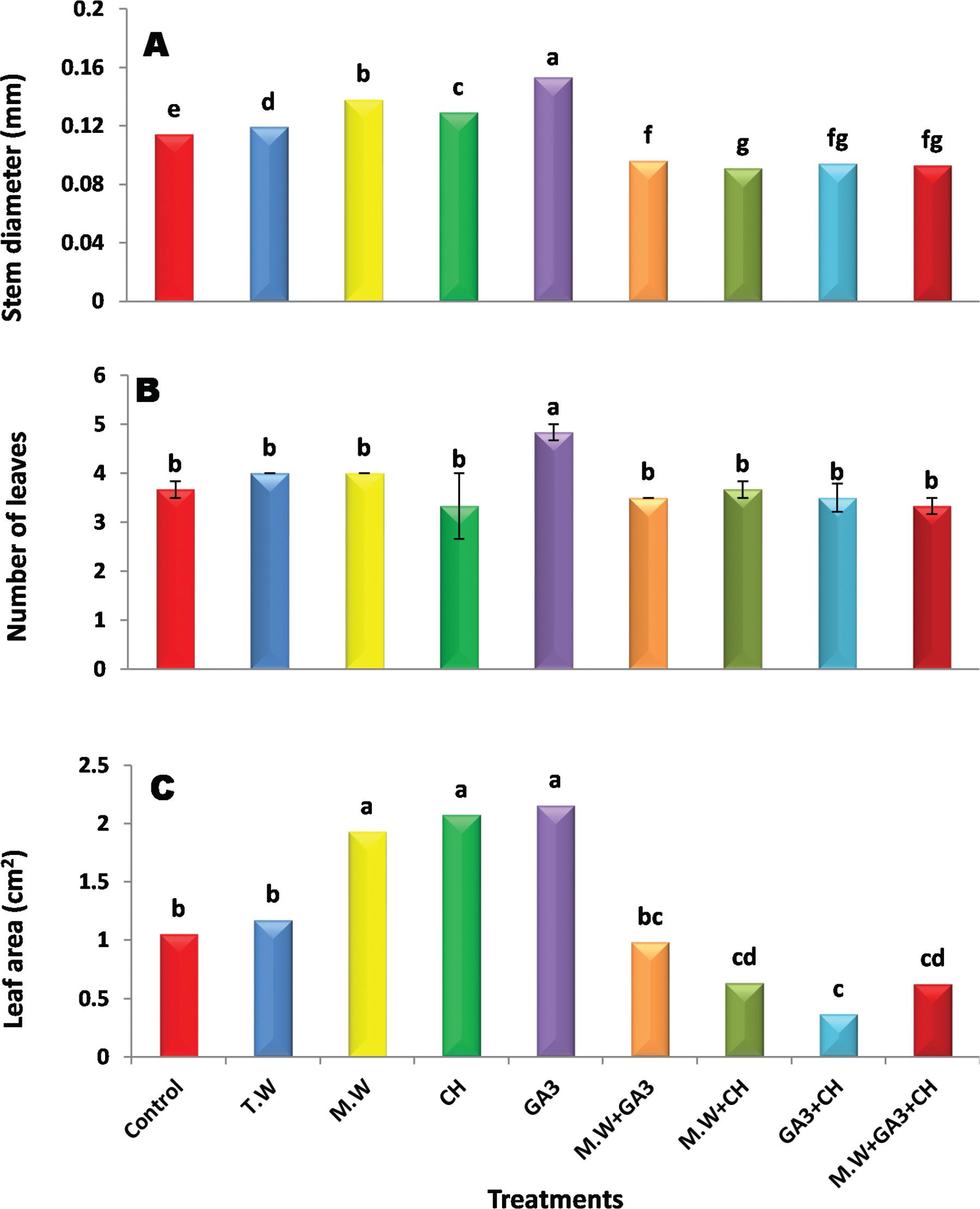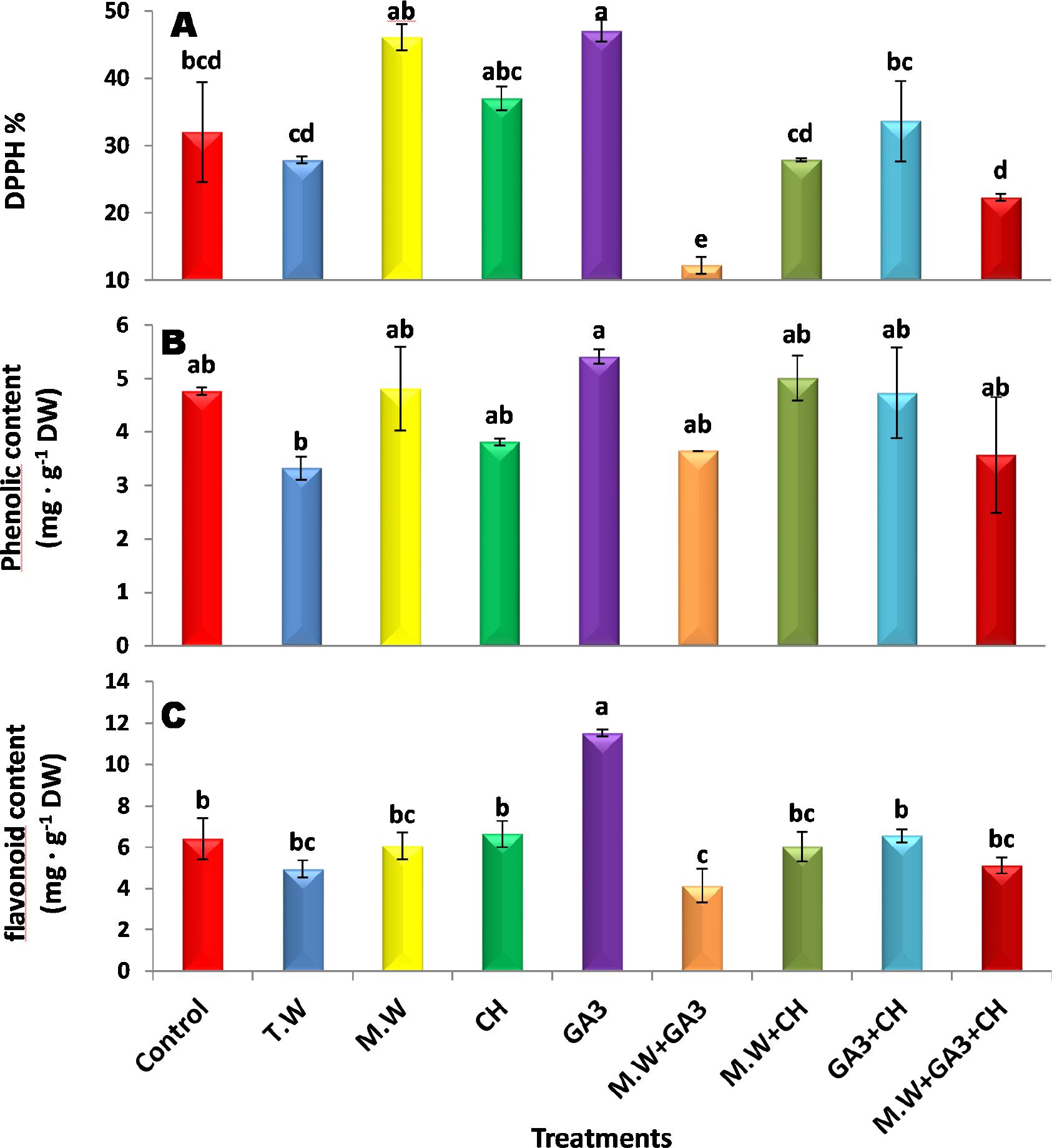 | Treatments | Control | T.W | M.W | CH | GA3 | M.W + GA3 | GA3 + CH | M.W + CH | M.W + GA3 + CH |