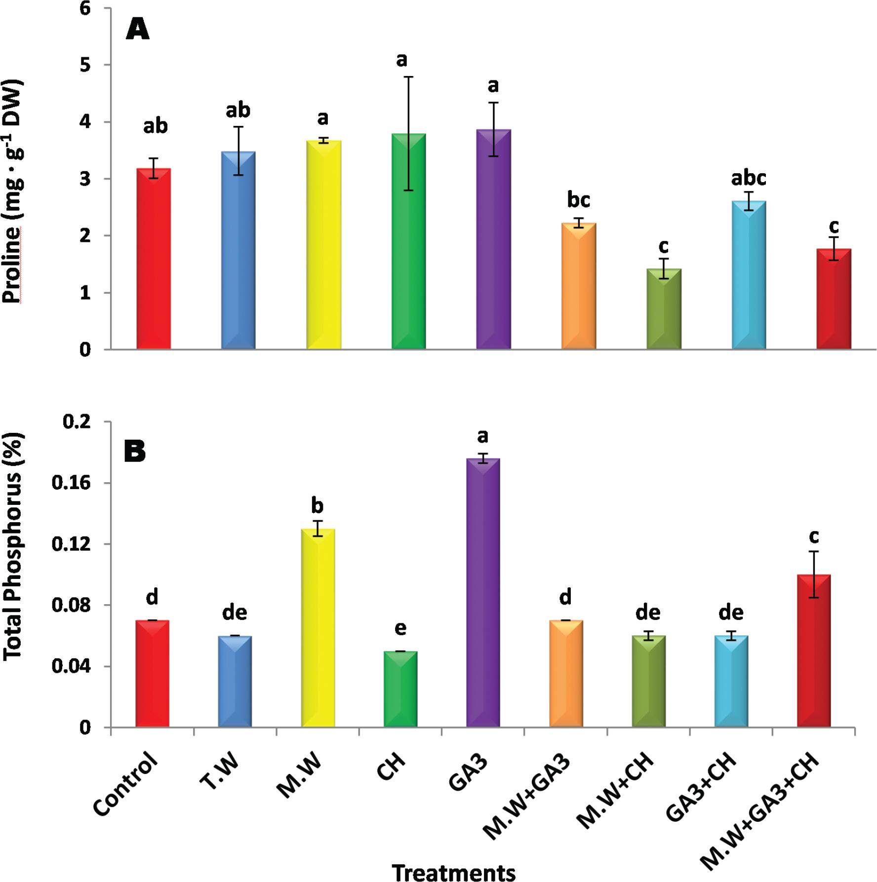 Effect of papaya seed pre-sowing treatments on proline content (mg · g−1 DW) (A) and total phosphorus (%) (B). Data are means of two seasons (2022/2023 and 2023/2024) and three replicates (n = 3) each season. The mean values ± SE of each parameter followed by different alphabetical letters are significantly different according to Duncan’s multiple range test at p ≤ 0.05. Control, dry seeds; T.W, tap water; M.W, magnetic water (2000 Gauss); CH, chitosan (1.5%); GA3, gibberellic acid (1000 ppm); M.W + GA3, magnetic water + gibberellic acid; M.W + CH, magnetic water + chitosan; GA3 + CH, gibberellic acid + chitosan; M.W + GA3 + CH, magnetic water + gibberellic acid + chitosan.
