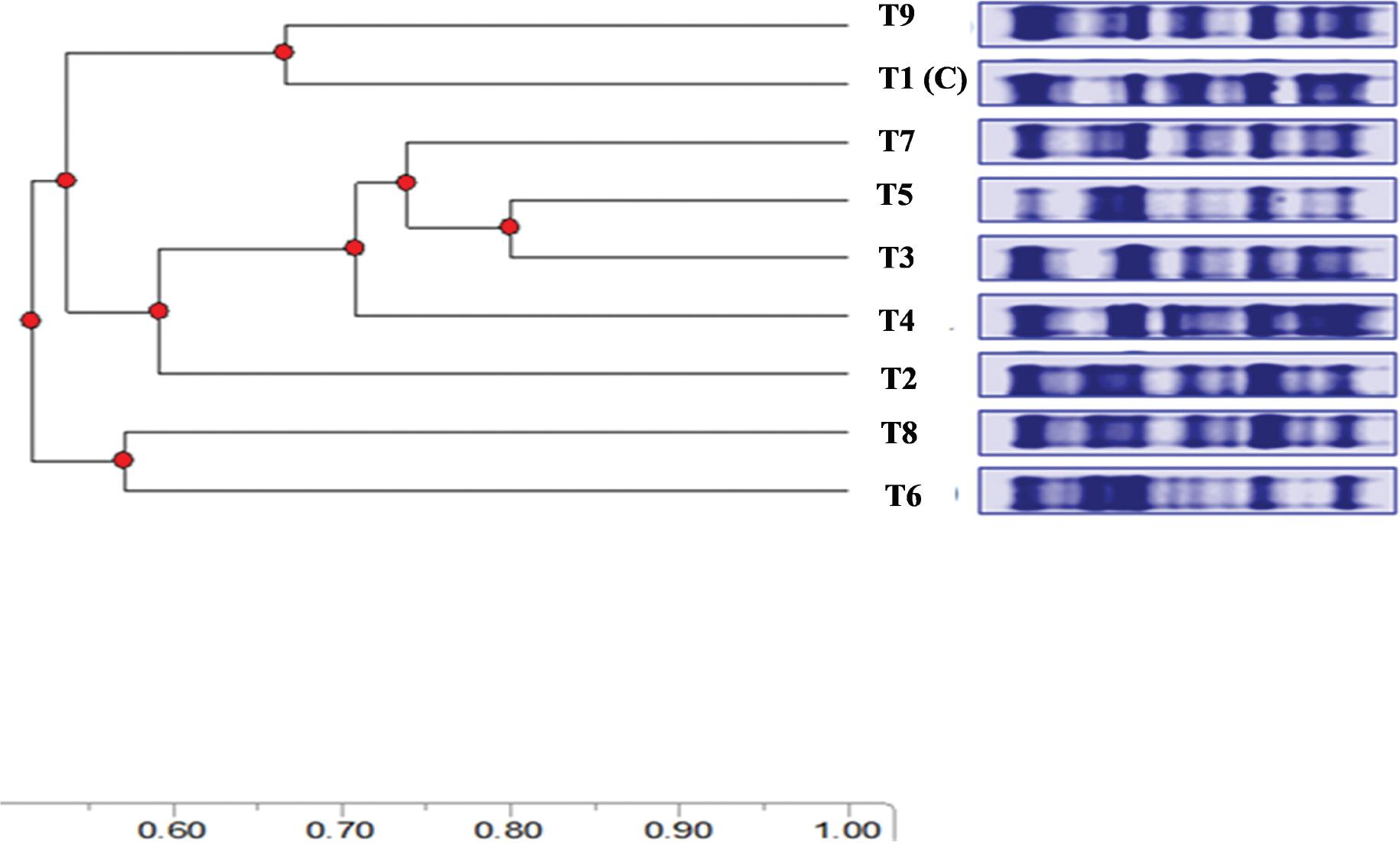 Dendrogram derived from separate evaluation of SDS-PAGE protein profiles of eight treated and untreated papaya seeds constructed data using UPGMA and similarity matrices computed according to Dice coefficient. T1 (C), Control (dry seeds); T2, tap water (T.W); T3, magnetic water (M.W, 2000 Gauss); T4, chitosan (CH, 1.5%); T5, gibberellic acid (GA3, 1000 ppm); T6, M.W (2000 Gauss) + GA3 (1000 ppm); T7, M.W (2000 Gauss) + CH (1.5%); T8, GA3 (1000 ppm) + CH (1.5%); T9, M.W (2000 Gauss) + GA3 (1000 ppm) + CH (1.5%). SDS-PAGE, sodium dodecyl sulphate polyacrylamide gel electrophoresis; UPGMA, unweighted pair-group method with arithmetic averages.