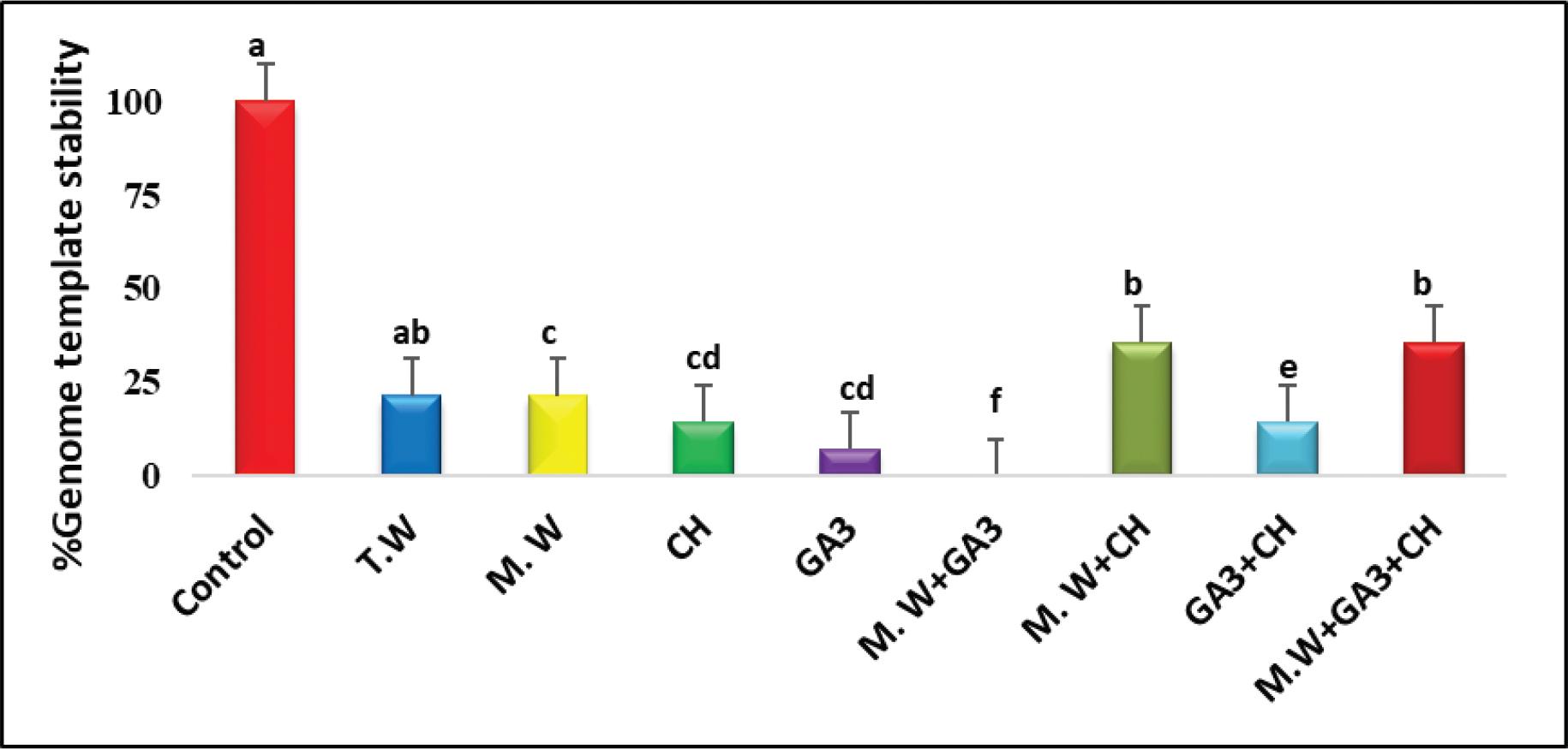 Genomic-DNA template stability was used to reflect changes in SDS profiles and to compare these changes with modification in papaya growth parameters and phytochemical characteristics. GTS% is related to the level of DNA damage, the efficiency of DNA repair and replication. The GTS% for untreated plant seedlings was defined as 100%, and there were significant decreases in the GTS of all treated plants. The obtained result indicated that the most negative significant changes in GTS% were induced by M.W (2000 Gauss) + GA3 (1000 ppm) treatment. The highest GTS% was conserved by mixed treatments M.W (2000 Gauss) + CH (1.5%) and M.W (2000 Gauss) + GA3 (1000 ppm) + CH (1.5%) followed by singular treatments; GTS% values of T.W and M.W (2000 Gauss) treatments were found to be 35.71% and 21.43%, respectively.