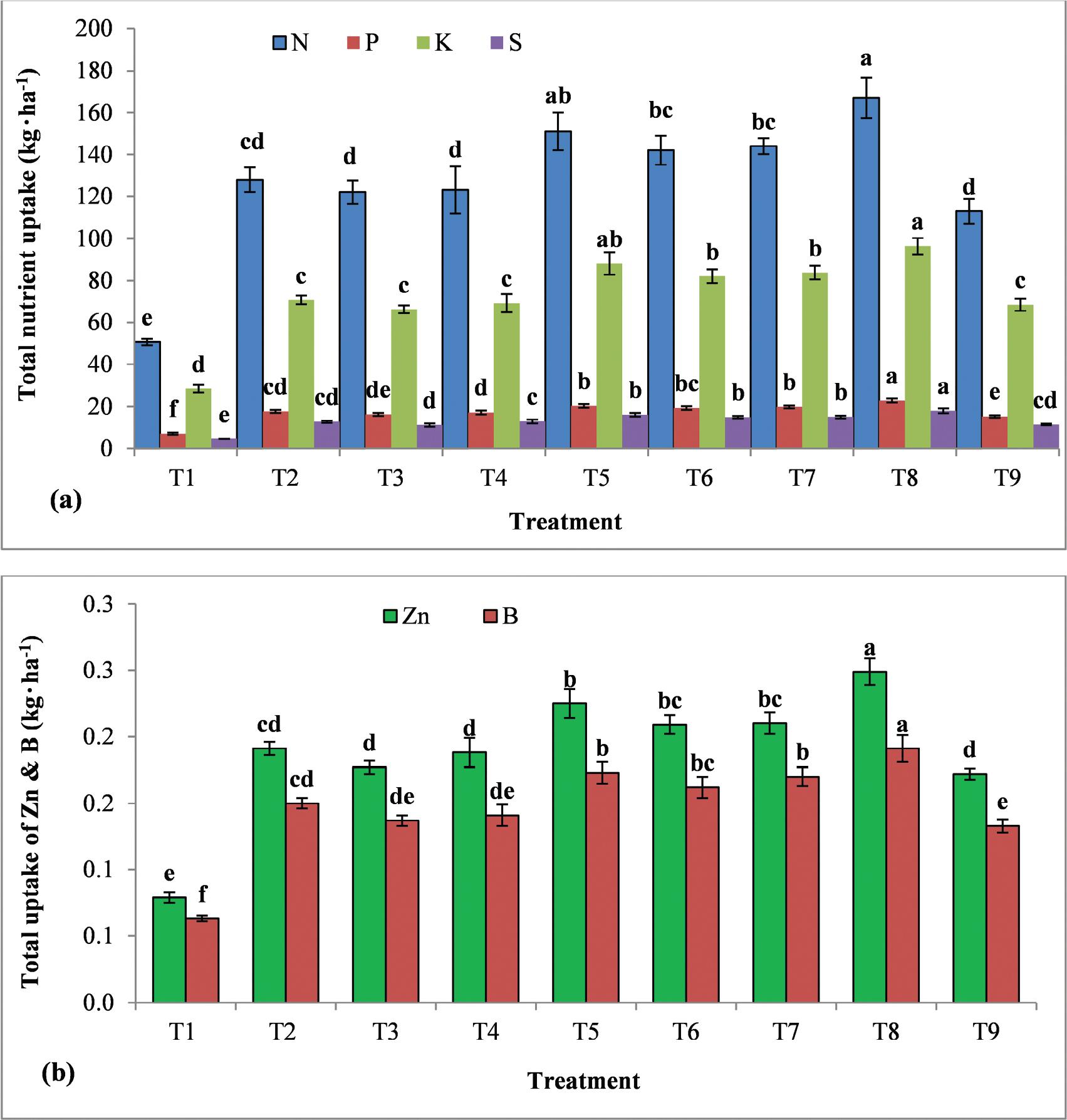 | Treatments | N | P | K | S | Zn | B |