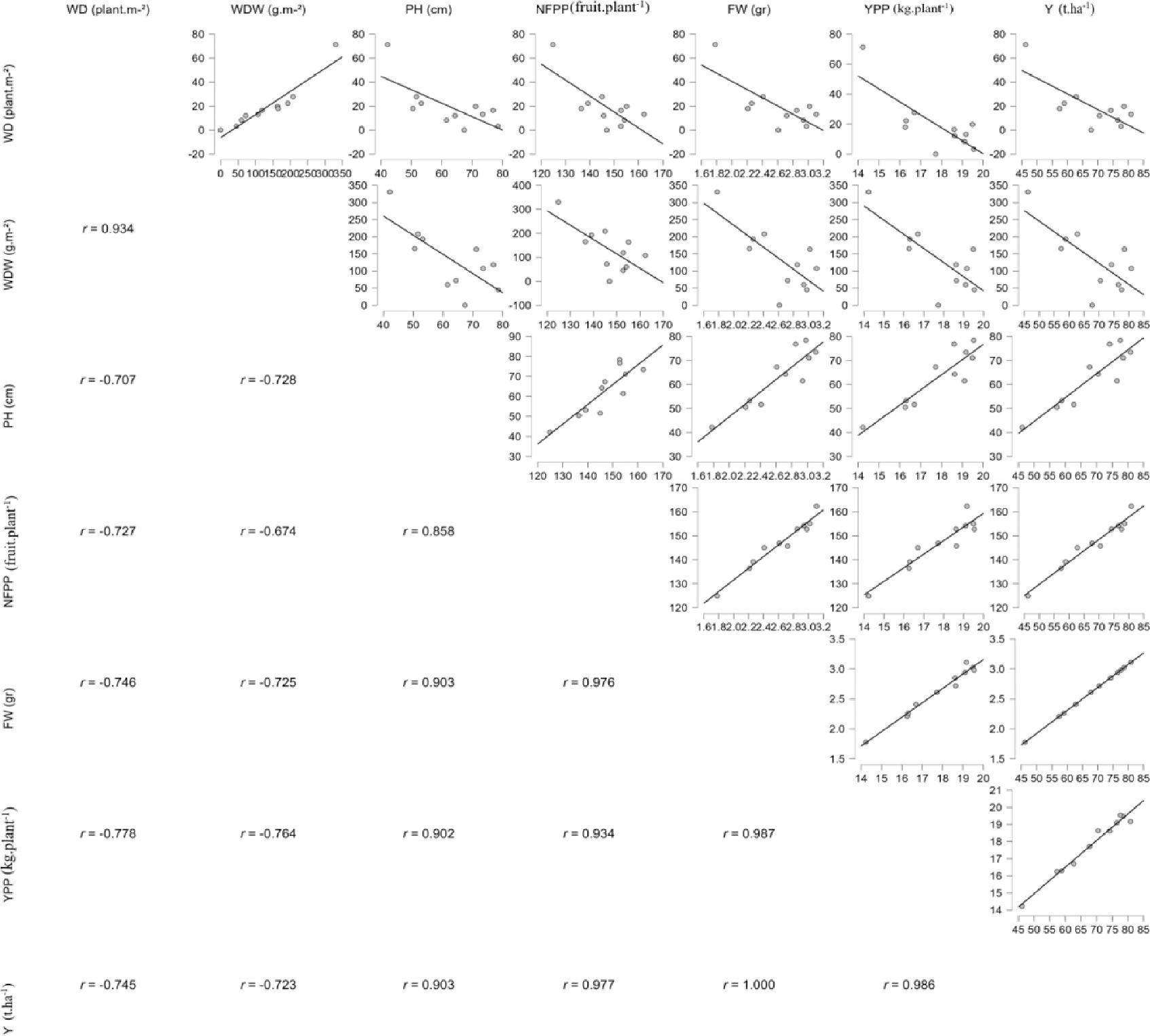 | Treatments | Fruit length (cm) | Fruit diameter (cm) | Fruit firmness (kg · cm−2) | Marketable yield (t · ha−1) | Unmarketable yield (t · ha−1) |