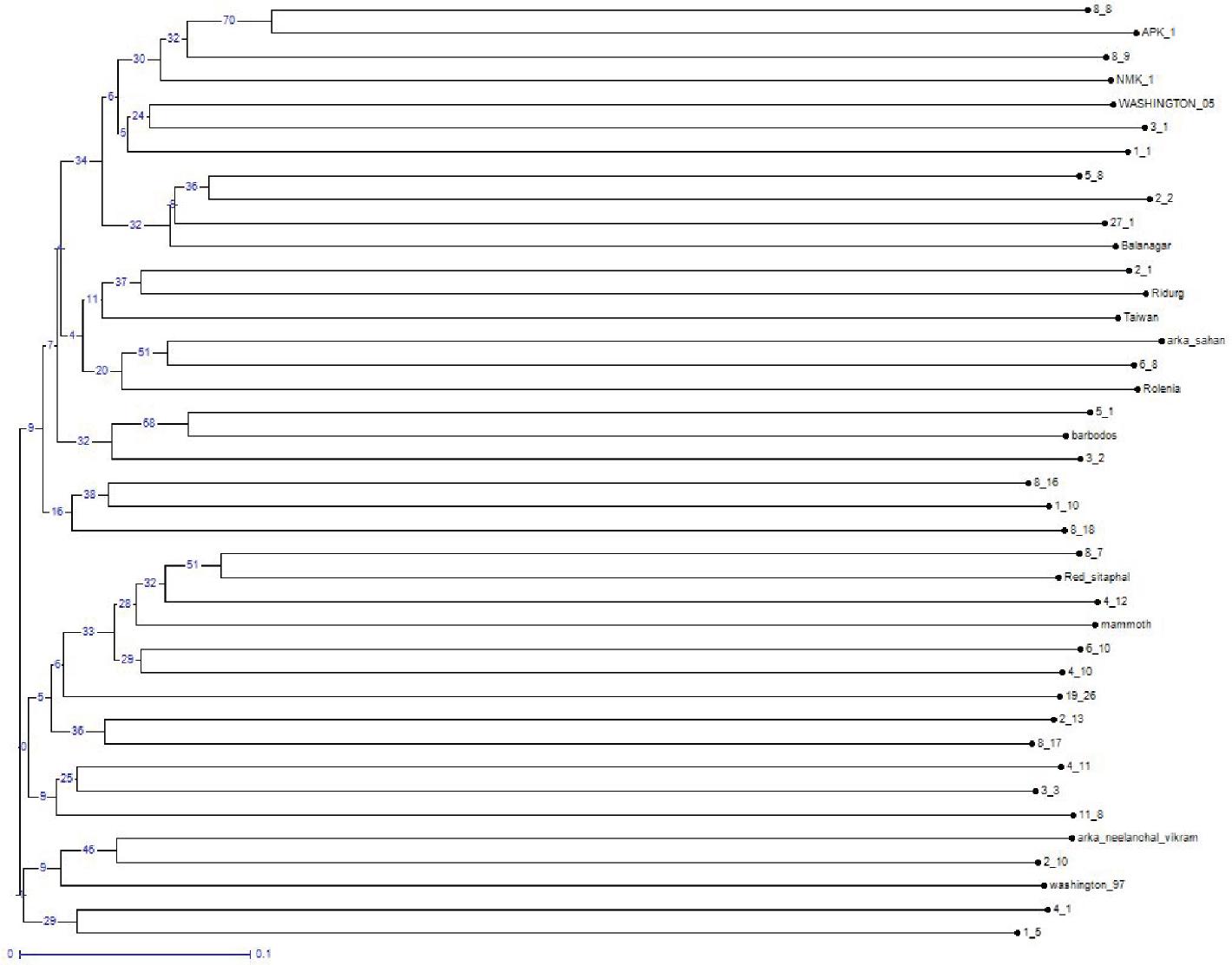 Dendrogram analysis of A. squamosa genotypes using SSR markers data. SSR, simple sequence repeat.