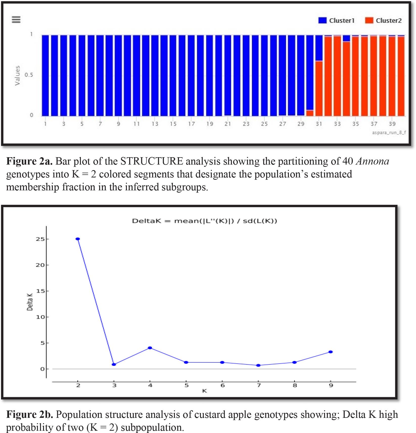 In this study, all 70 SSR markers were highly polymorphic, with PIC values exceeding 0.5 (Table 3), indicating a high level of genetic diversity among the 40 Annona genotypes. This was further supported by the high Ho values, which ranged from 0.250 to 1.000, and He values, which ranged from 0.781 to 0.978 (Table 3). These results demonstrate the effectiveness of speciesspecific SSR markers for assessing genetic diversity in A. squamosa. Additionally, the Ho being higher than expected suggests the presence of at least two isolated populations among the genotypes studied.