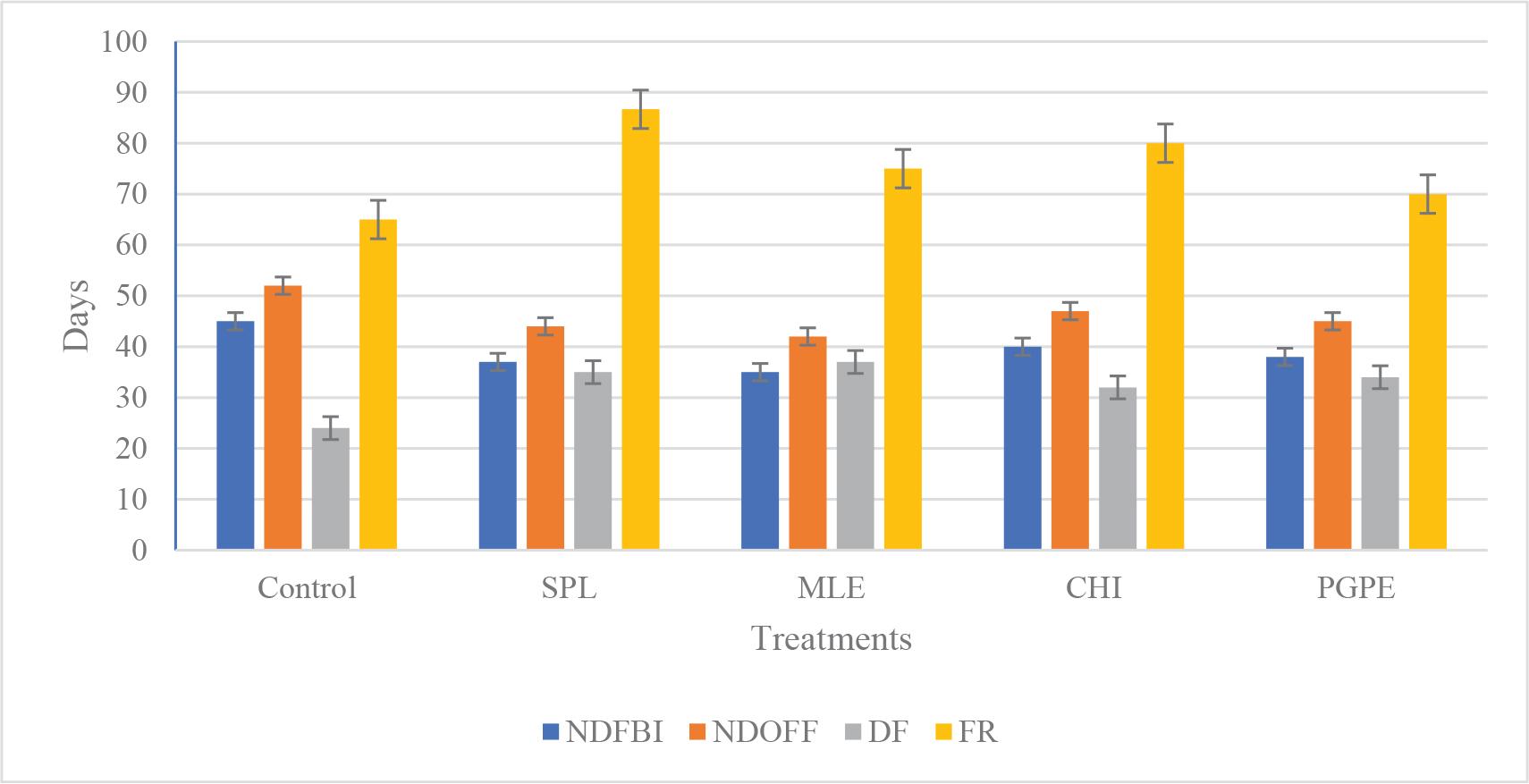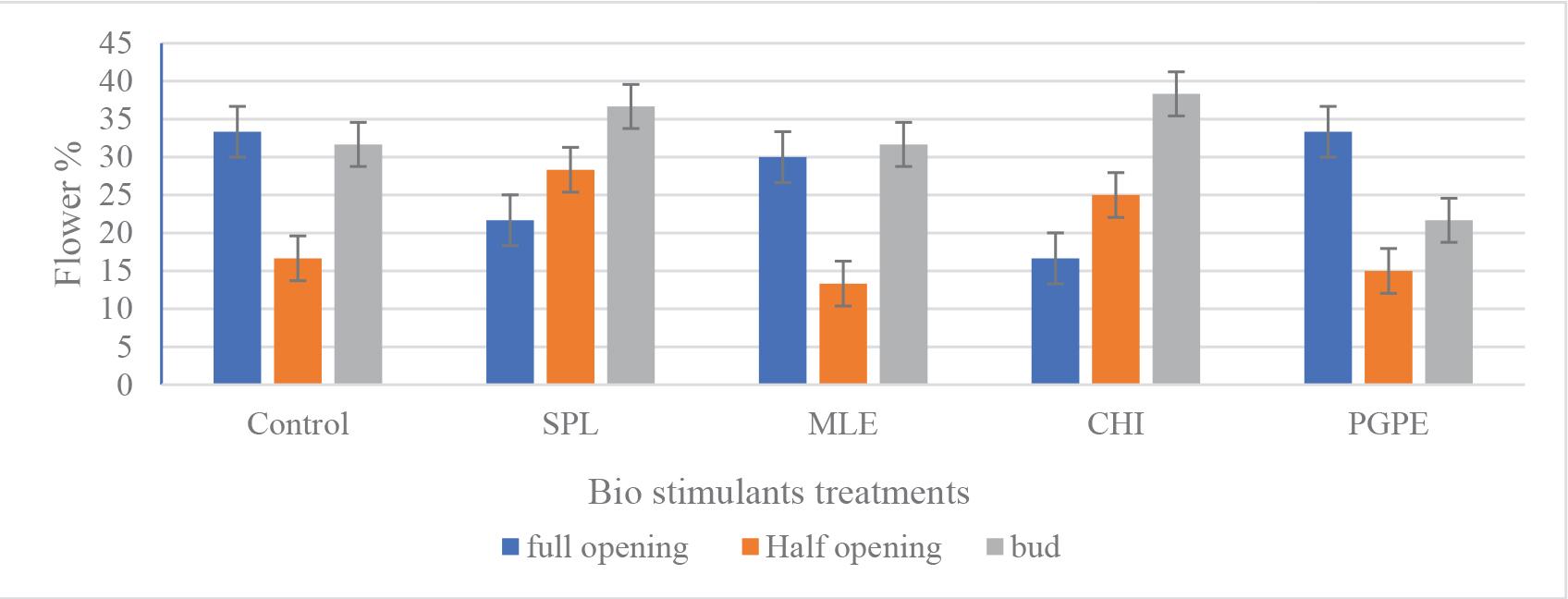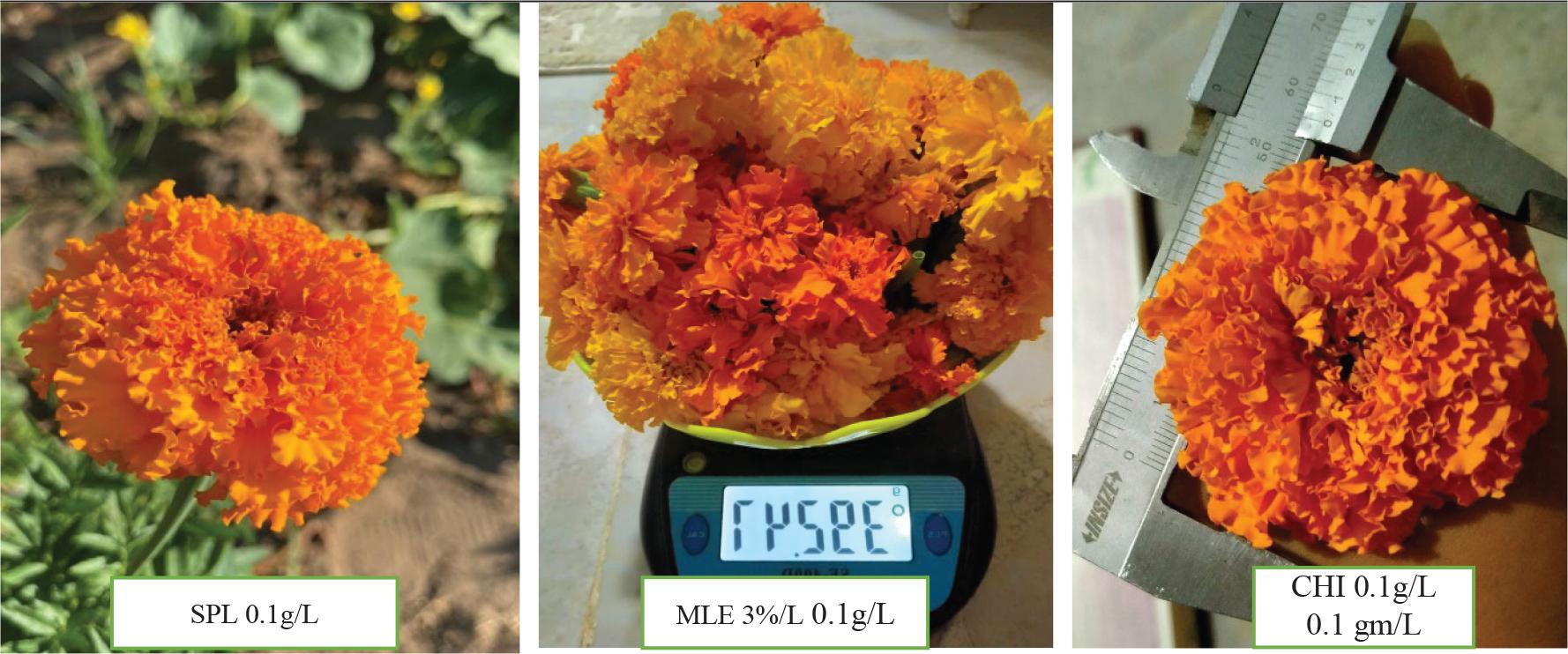 An increase in the DF and FR suggests that BS treatments not only initiate flowering sooner but also sustain it longer. This could result from improved nutrient uptake and enhanced metabolic activity, as BSs are reported to boost plant vigour and stress tolerance (Bulgari et al., 2019; Franzoni et al., 2022). The data suggest that treatments with SPL significantly impacted the maximum flower rate% compared with other treatments and the control. This indicates that applying SPL, enhanced nutrient uptake with its array of amino acids, vitamins and minerals, may improve overall plant health, indirectly promoting more robust flowering. CHI is known for eliciting defence responses and could be triggering secondary metabolic pathways that favour prolonged flowering (Hadwiger, 2013). Extended flowering may contribute to better ornamental quality and potentially higher seed or fruit yields in commercial applications. The findings in Figure 2 are in line with the current literature on plant BSs, supporting their role in modulating growth and developmental processes to achieve improved flowering performance. This is consistent with other studies on T. erecta and T. patula, highlighting the beneficial effects of BSs on plant growth and flowering characteristics (Du Jardin, 2015; Thumar et al., 2016; Preeti and Pooja, 2024).
