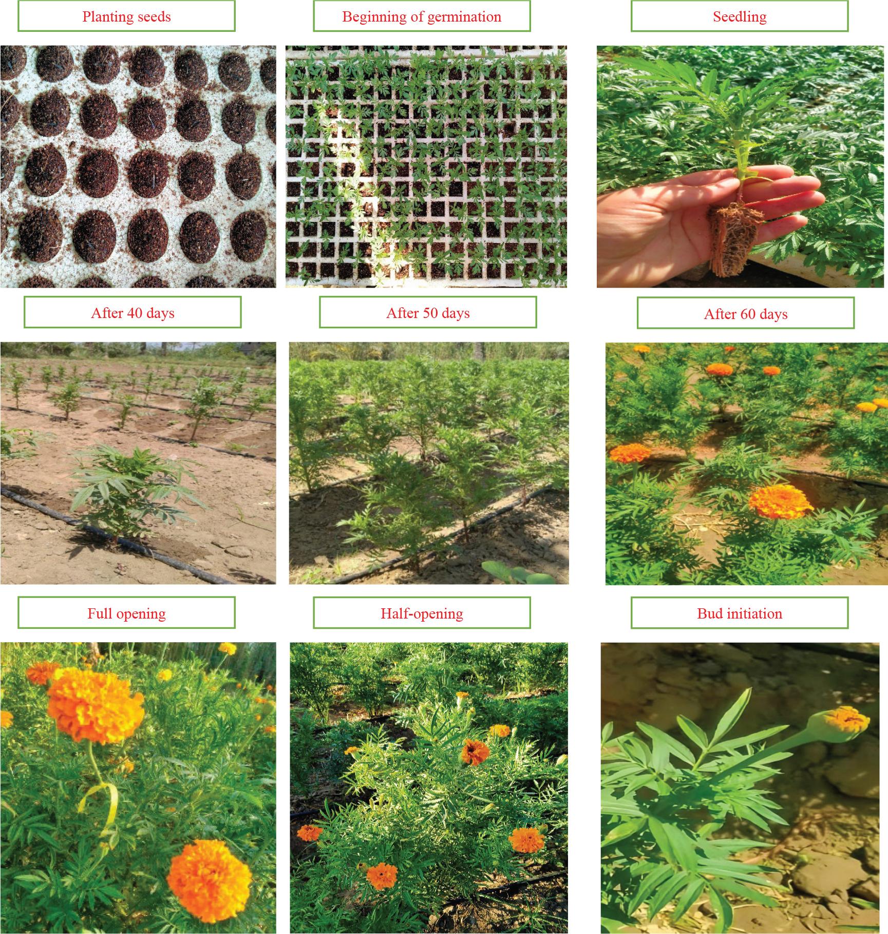 Progressive Tagetes erecta and flower development stages at the field experiment.