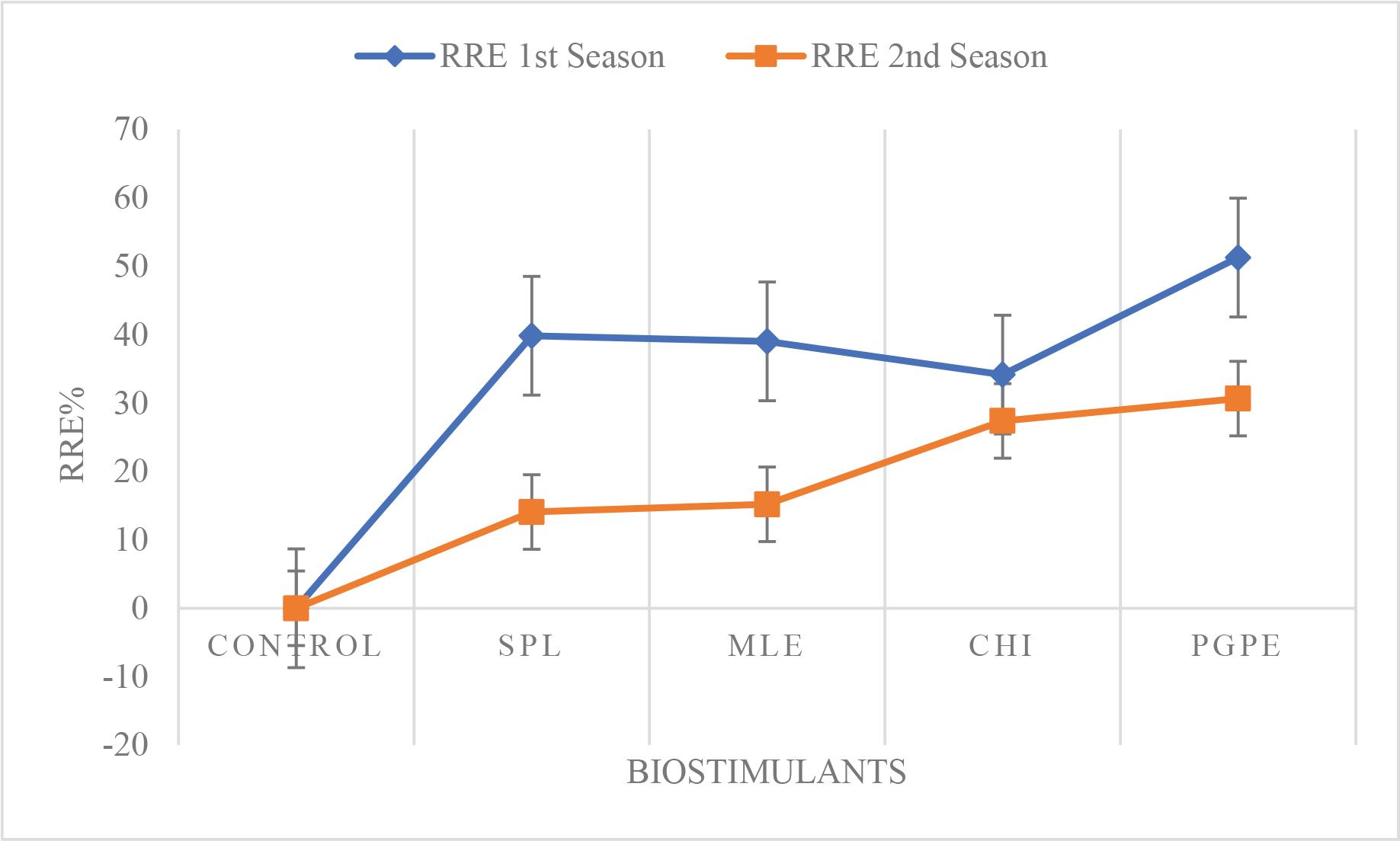 BSs, biostimulants; CHI, chitosan; MLE: Moringa leaves extract; PGPE, pollen grains date palm extract; RRE, Relative root elongation; SD, standard deviation; SPL, Spirulina.