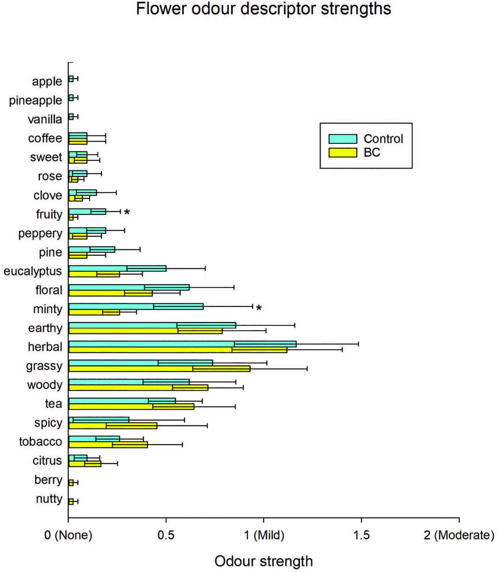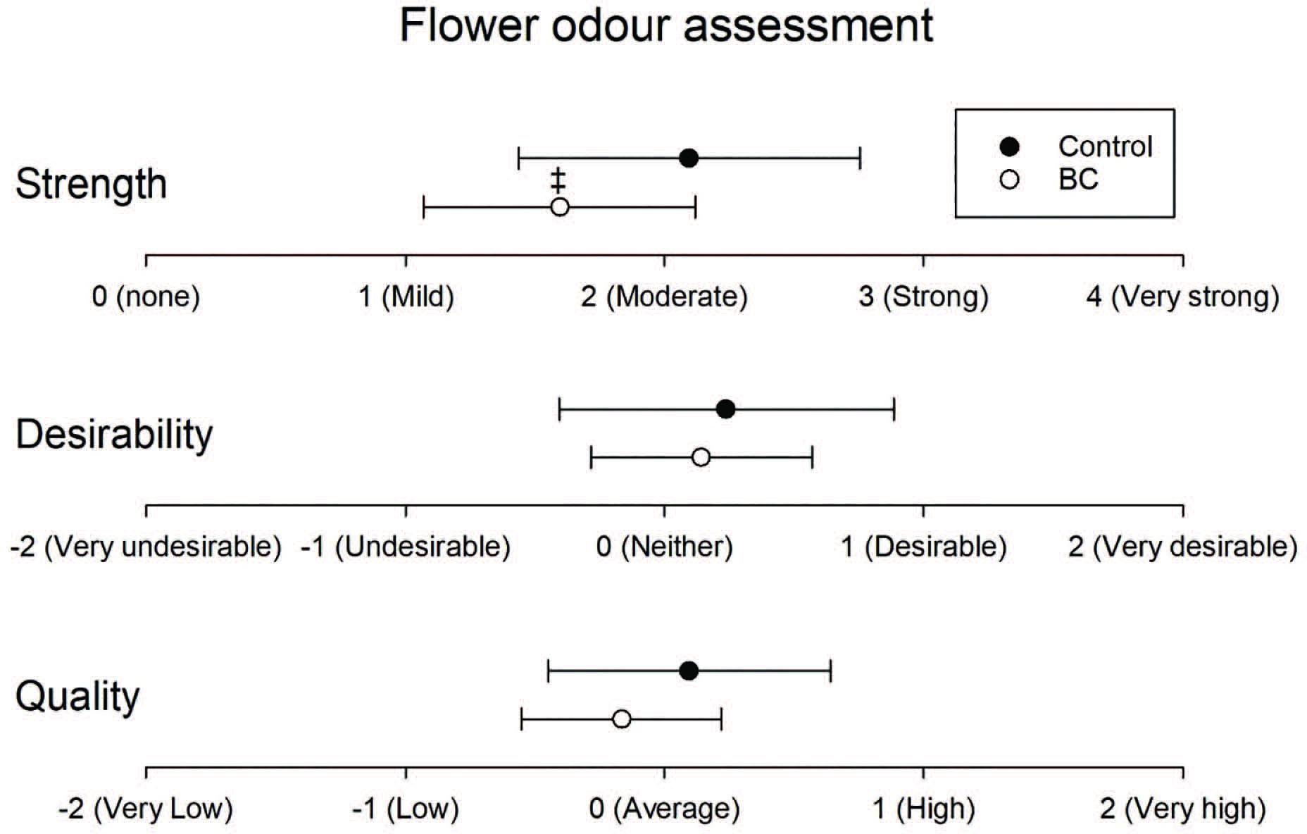 Profile analysis of the sensory data indicated that the profiles were not significantly different between treatments (Figure S3 in Supplementary Materials). Comparison of individual sensory measures indicated that the flower odour strength was significantly reduced (p = 0.007) from an average of 2.1 for control to 1.6 for BC treatment (Figure 1, Table S5 in Supplementary Materials), which represented an on-average 0.5 change on a 5-point Likert scale. No significant differences were identified between the treatments for their desirability (p = 0.547) or quality (p = 0.103), which had means for both treatment groups close to 0 (neither desirable nor undesirable and average quality, respectively).