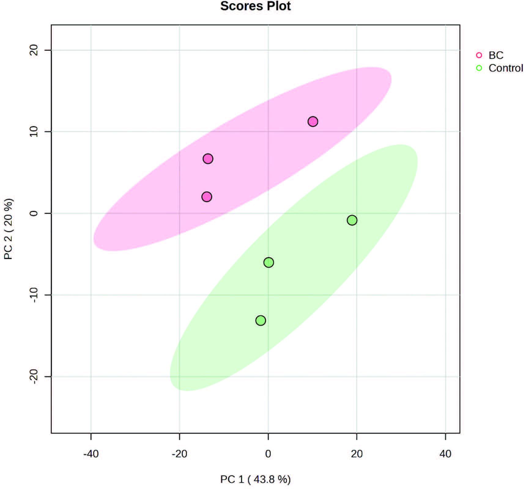 Changes to cannabis sugar leaf metabolites from growth with a BC. PCA of sugar leaf metabolite profiles from three biological replicates, with colours indicating treatment 95% confidence regions. BC, biostimulant complex; PCA, principal component analysis.