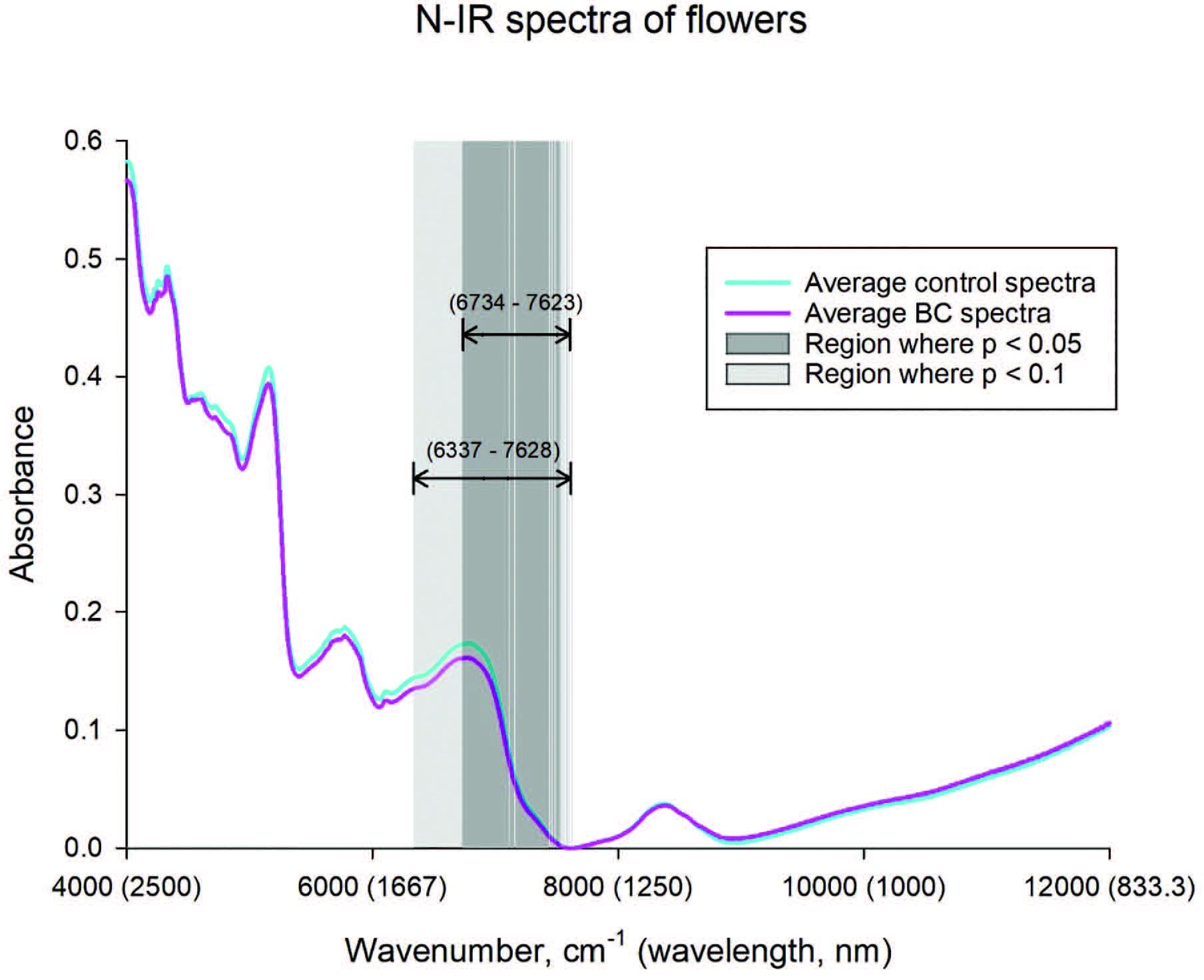 Assessment of BC impact to cannabis flower N-IR spectra. Average control (blue) and BC (magenta) N-IR spectra of cured cannabis flowers analysed between 4000 cm−1 and 12000 cm−1 (n = 9). Shading indicates wavenumbers with statistical differences, with dark shading representing statistical significance p < 0.05 and light shading representing marginal significance of p < 0.1, as determined by an independent samples t-test. BC, biostimulant complex; N-IR, near-infrared.