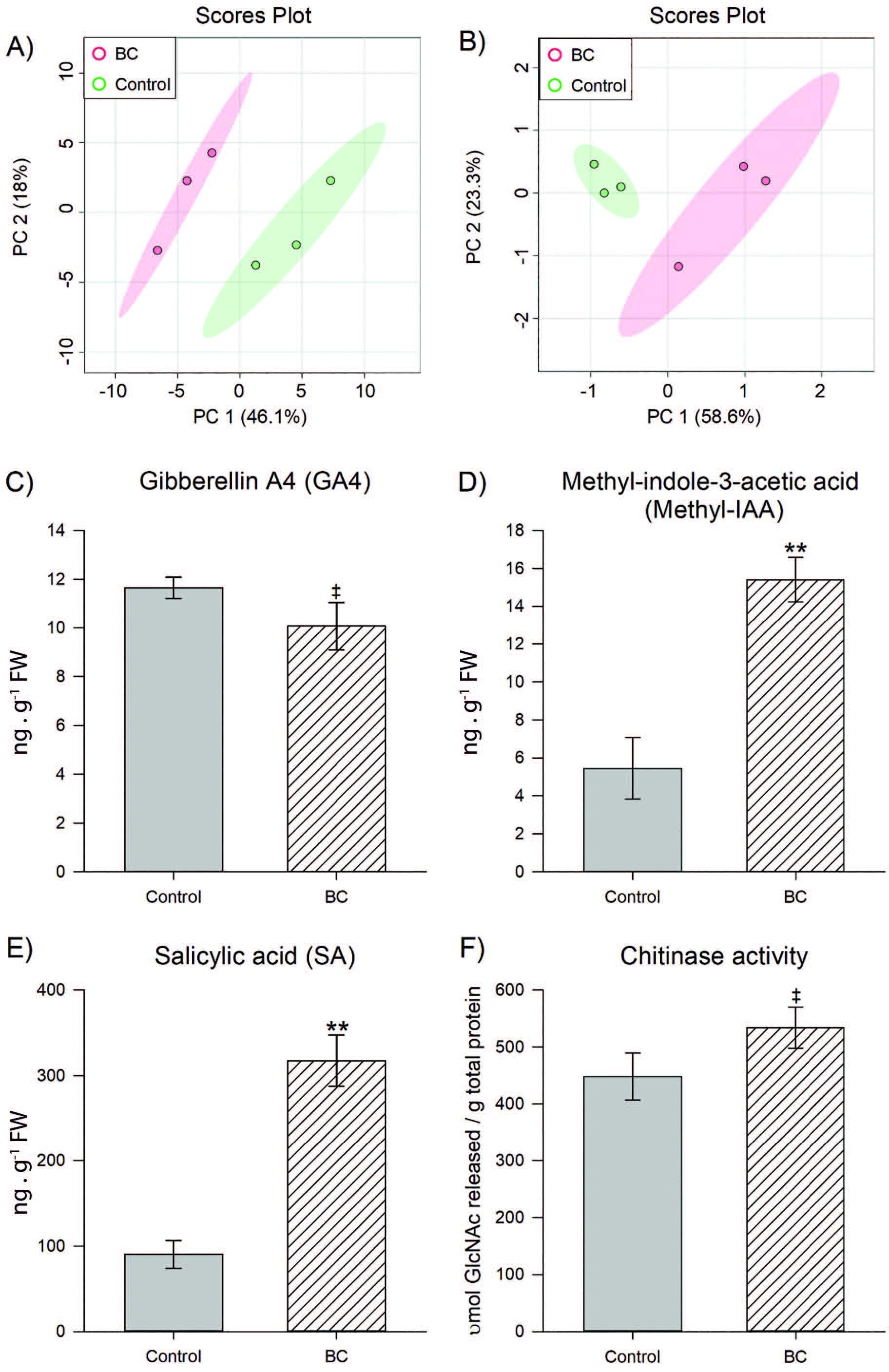 Change to cannabis root biochemistry from growth with a BC. PCA of (A) root metabolite profiles and (B) root phytohormone profiles. Average root concentrations ± standard deviation of (C) GA4, (D) Methyl-IAA, and (E) SA, and (F) root chitinase activity, following 1 week of control or BC treatments. All data based on three biological replicates for control and BC, with significant differences indicated as ** for p < 0.01 and marginal significance indicated as ‡ for p < 0.1, as determined by an independent samples t-test. BC, biostimulant complex; GA4, gibberellin A4; IAA, indole-3-acetic acid; Methyl-IAA, methyl indole-3-acetic acid; PCA, principal component analysis; SA, salicylic acid.
