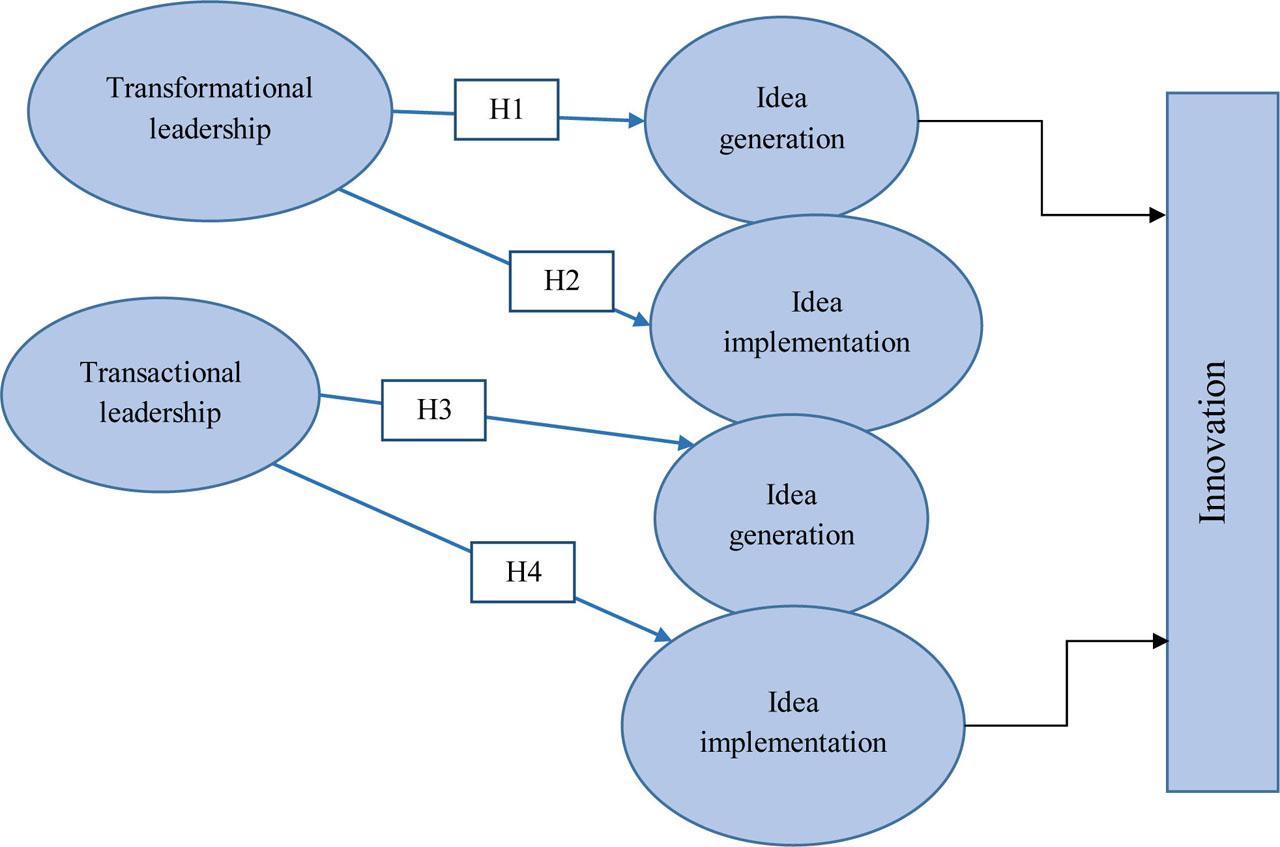 Numerous studies have analyzed the relationship between transactional and transformational leaderships on the one hand and innovation on the other. Transformational leadership introduces the system of employees’ values, which encourages innovations (Gardner and Avolio, 1998; Bass, 1985); this – in turn – increases the motivation of the employees (Shamir, House, and Arthur, 1993), thereby encouraging creativity (Sosik, Avolio, and Kahai, 1997; Wang, Tsai, and Tsai, 2014; Jaiswal and Dhar, 2015).