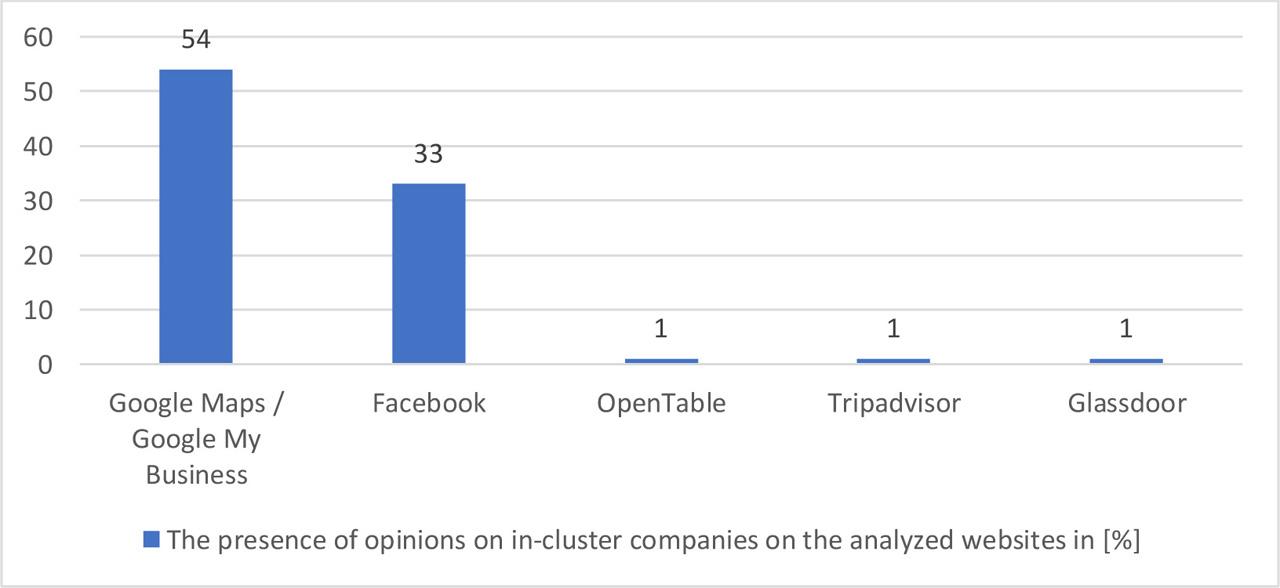 OpenTable, TripAdvisor, and Glassdoor are portals that collect theme-based opinions. OpenTable features reviews of restaurants, TripAdvisor features reviews of tourism in the broadest sense, and Glassdoor features reviews of employers; therefore, they are not common and the percentage of companies from clusters on which reviews can be found on these sites is about 1%.