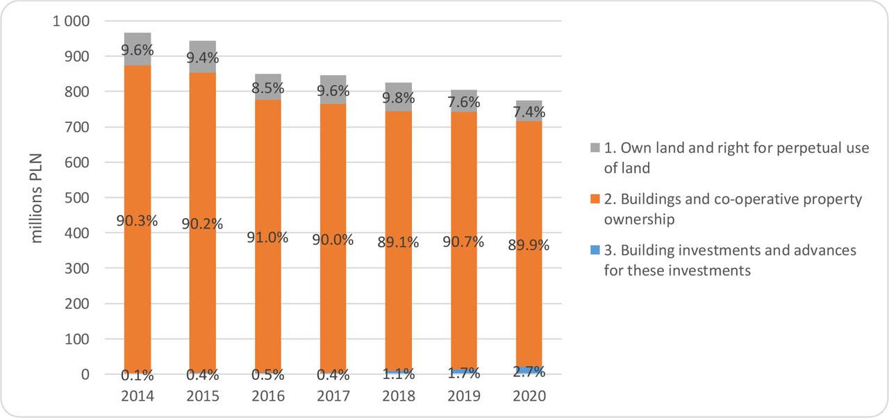 The value of land and perpetual usufruct rights during the 7-year audit decreased by approximately 10% (from PLN 95 million in 2014 to PLN 84 million in 2020). The share of land and perpetual usufruct rights in the total real estate increased in all years of the study, apart from 2018 – from 29.7% in 2014 to 36.4% in 2020. This increase took place at the expense of investments in buildings, structures, and cooperative ownership rights to premises, which accounted for over 60% of total real estate investments. The value of this item decreased in each year of the analysis, from PLN 218 million in 2014 to PLN 145 million at the end of the study, recording a total decrease of approximately 30%. The share of construction investments and advances for these investments in the 7 years did not exceed 3% of the total real estate.