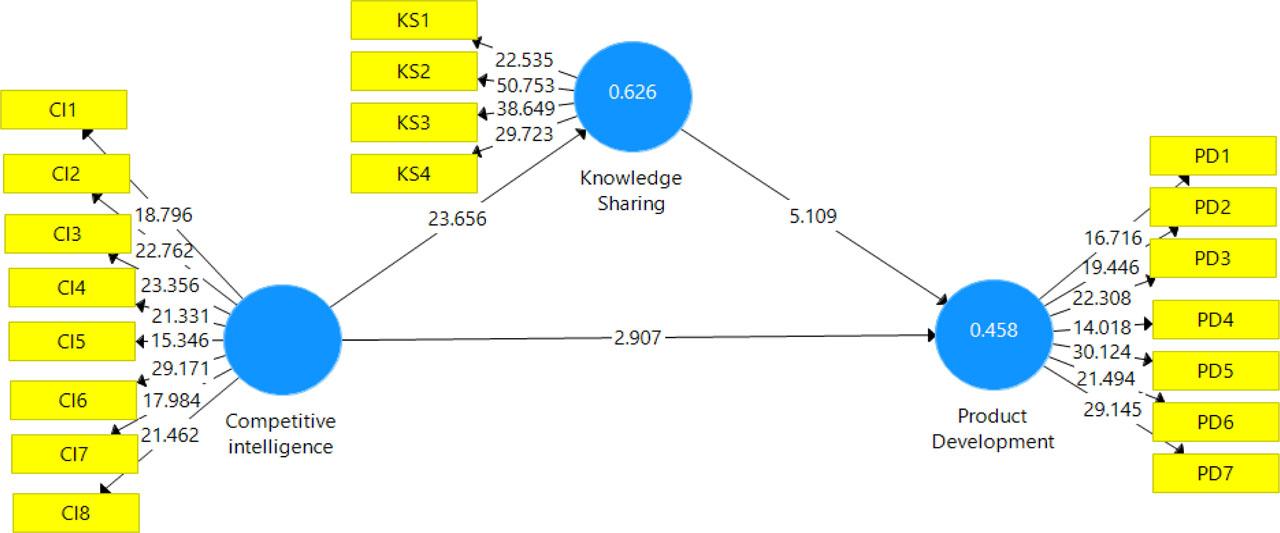 The study findings demonstrated several concluding remarks. First, competitive intelligence has a direct positive effect on product development and knowledge sharing, which means that when competitive intelligence increases, knowledge sharing and product development will also increase. Second, knowledge sharing has a direct positive impact on product development, which means that the higher the level of knowledge sharing, the more product development will take place. Third, knowledge sharing mediates the impact of competitive intelligence on product development, which means that the increase in competitive intelligence will lead to an increase in knowledge sharing, which in turn leads to an increase in product development.