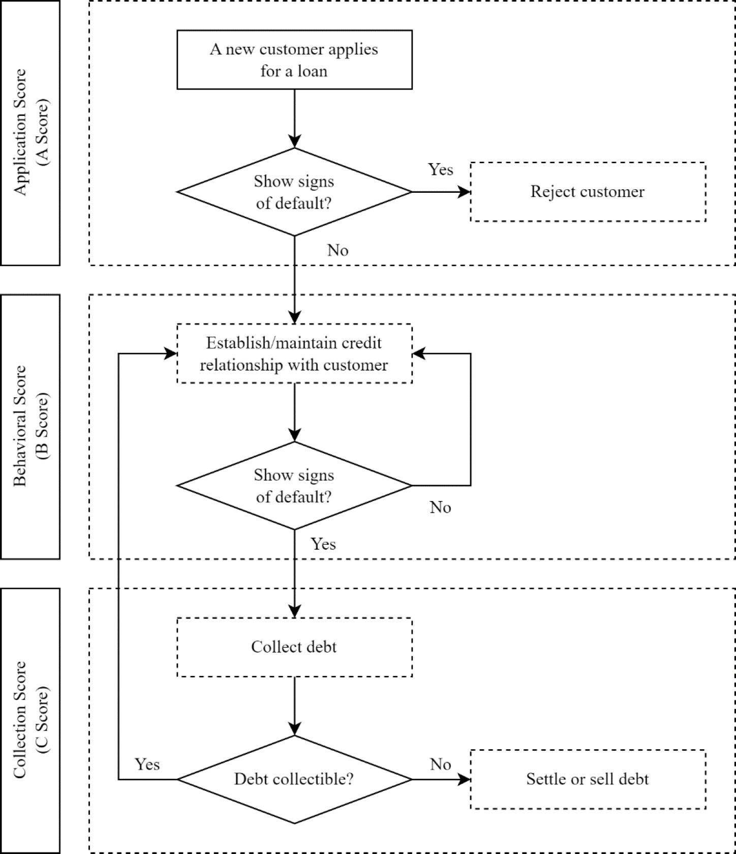 All three types of credit scores can reflect the lifecycle of a customer’s credit relationship with the bank. According to Figure 1, a new customer submitting a credit application will be scored based on the A Score. If approved, the customer is granted credit and begins the repayment process with the bank. This process is monitored by the B Score. If the customer defaults, the bank will initiate collection efforts and assess the debt recovery ability through the C Score.