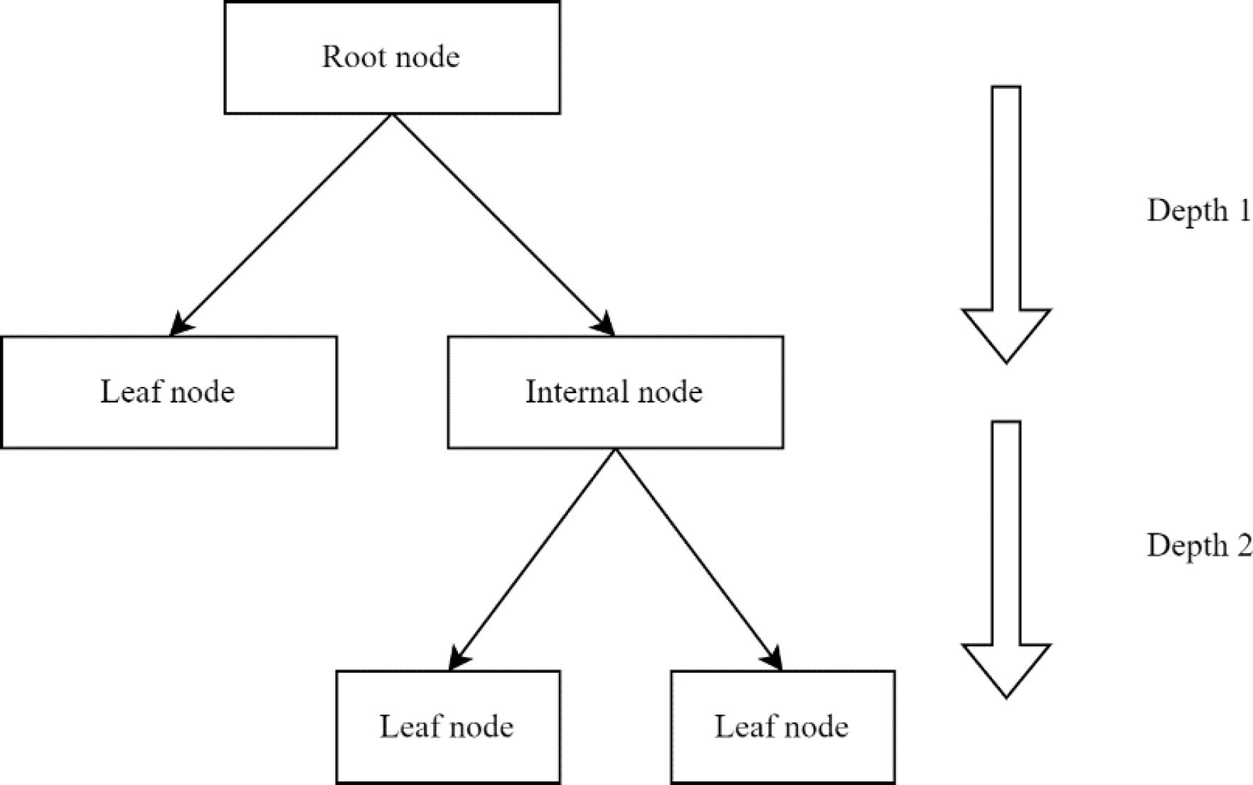 Decision tree is a classification model that uses variables to divide data into smaller samples. These samples are further divided in a similar manner until the labels of the data (target variable) can be predicted. Some related concepts in DT, as shown in Figure 2, include: