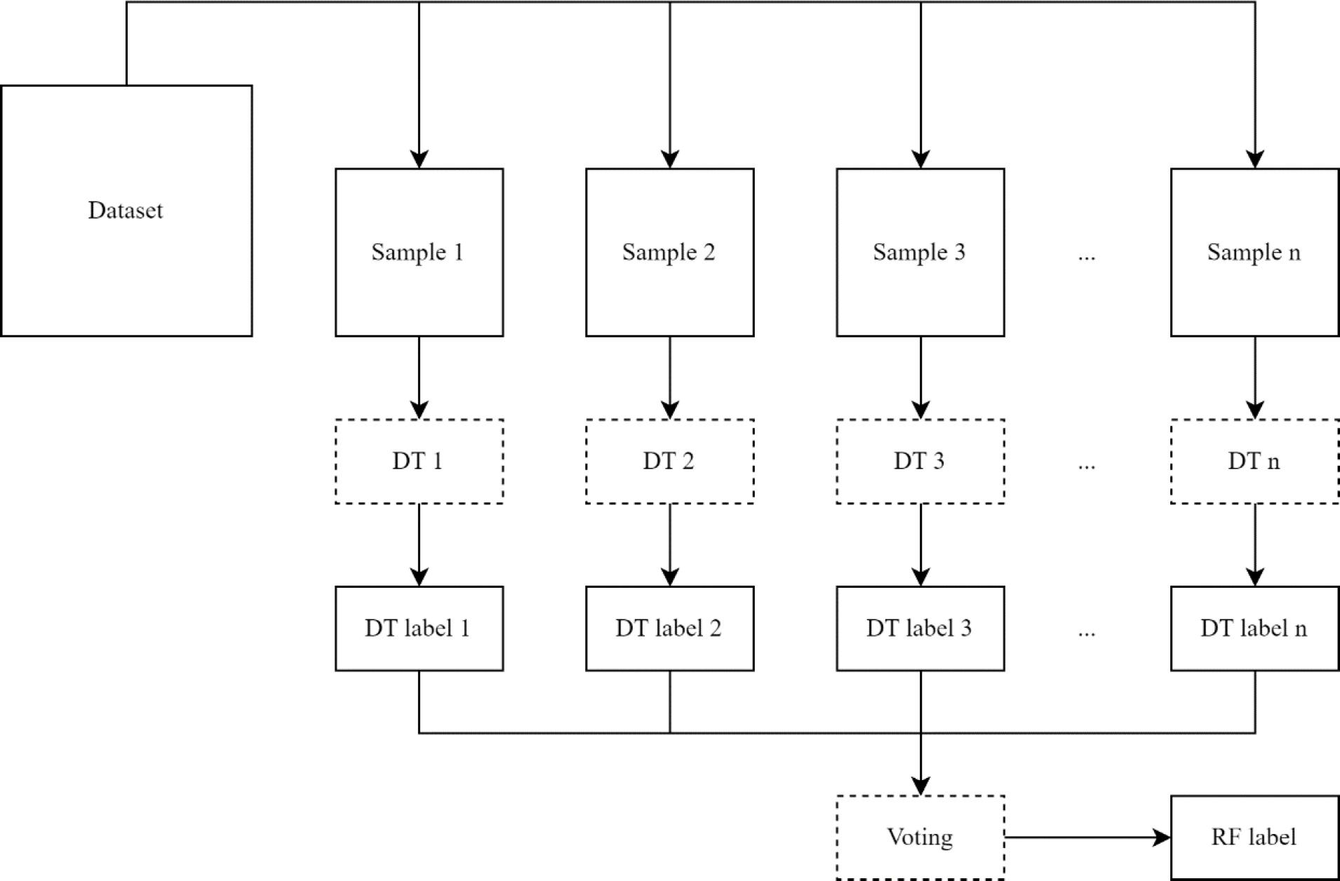 Random forest is a model that consists of multiple decision tree (DT). On a dataset, RF performs random sampling with replacement to create n data samples, each with a smaller or equal size compared to the original sample. For each obtained data sample, a DT model is built and used to predict the entire original dataset. RF includes n constructed DTs and utilizes a voting mechanism to determine the label for each data point. Thus, the essence of RF lies in multiple DTs, where RF has the additional task of labeling through each DT and aggregating the results to obtain the final label assignment.