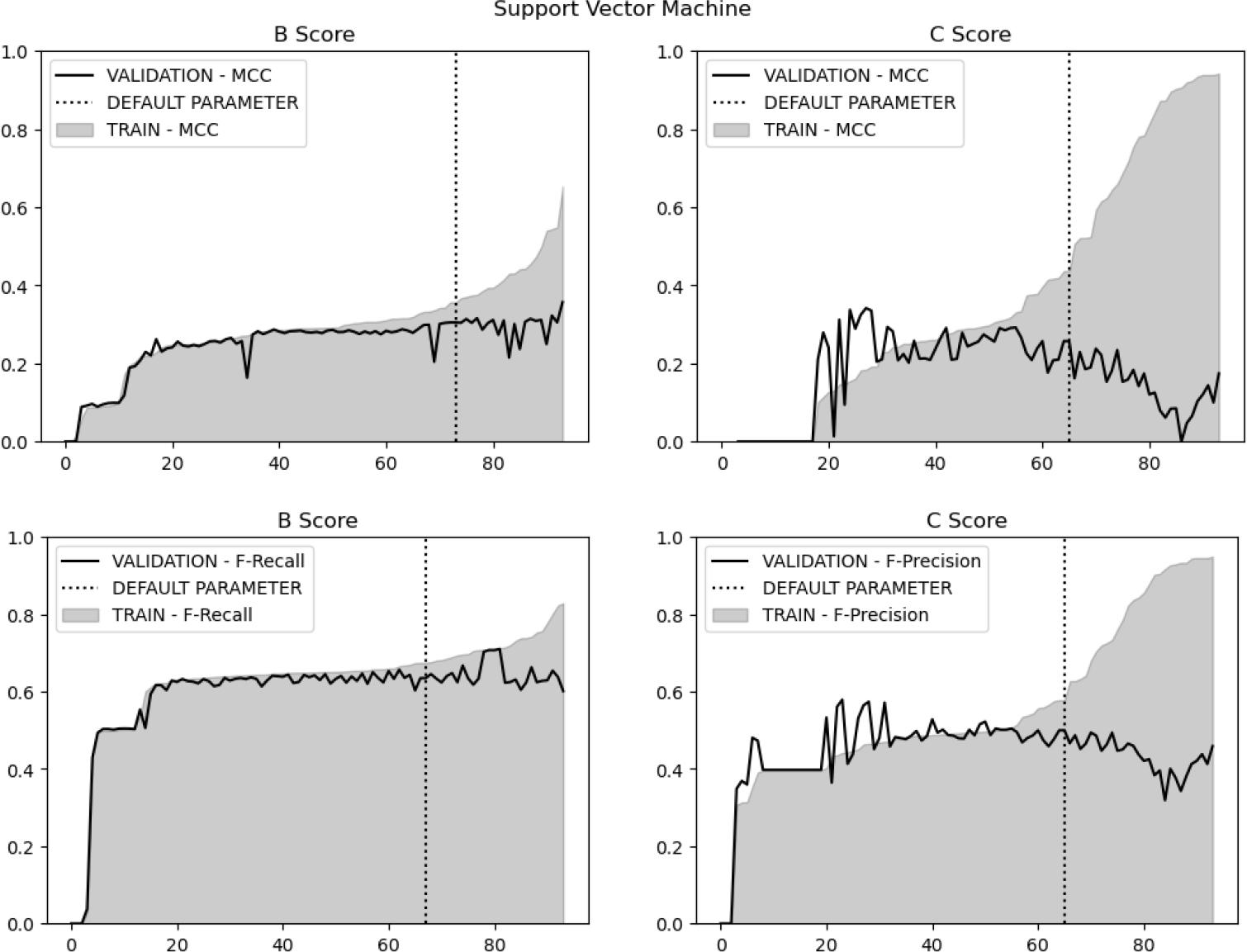 For SVM, although it has higher computational costs, it achieves better results compared to LG based on the highest MCC attained in both B Score and C Score datasets. Overfitting occurs with SVM, especially in the C Score dataset, where the MCC on the evaluation set tends to be contrary to the training set. In terms of trends, F-Recall and F-Precision follow a similar pattern to MCC. However, in terms of magnitude compared to LGR, there is not much improvement, fluctuating around 60% (B Score) and 50% (C Score).