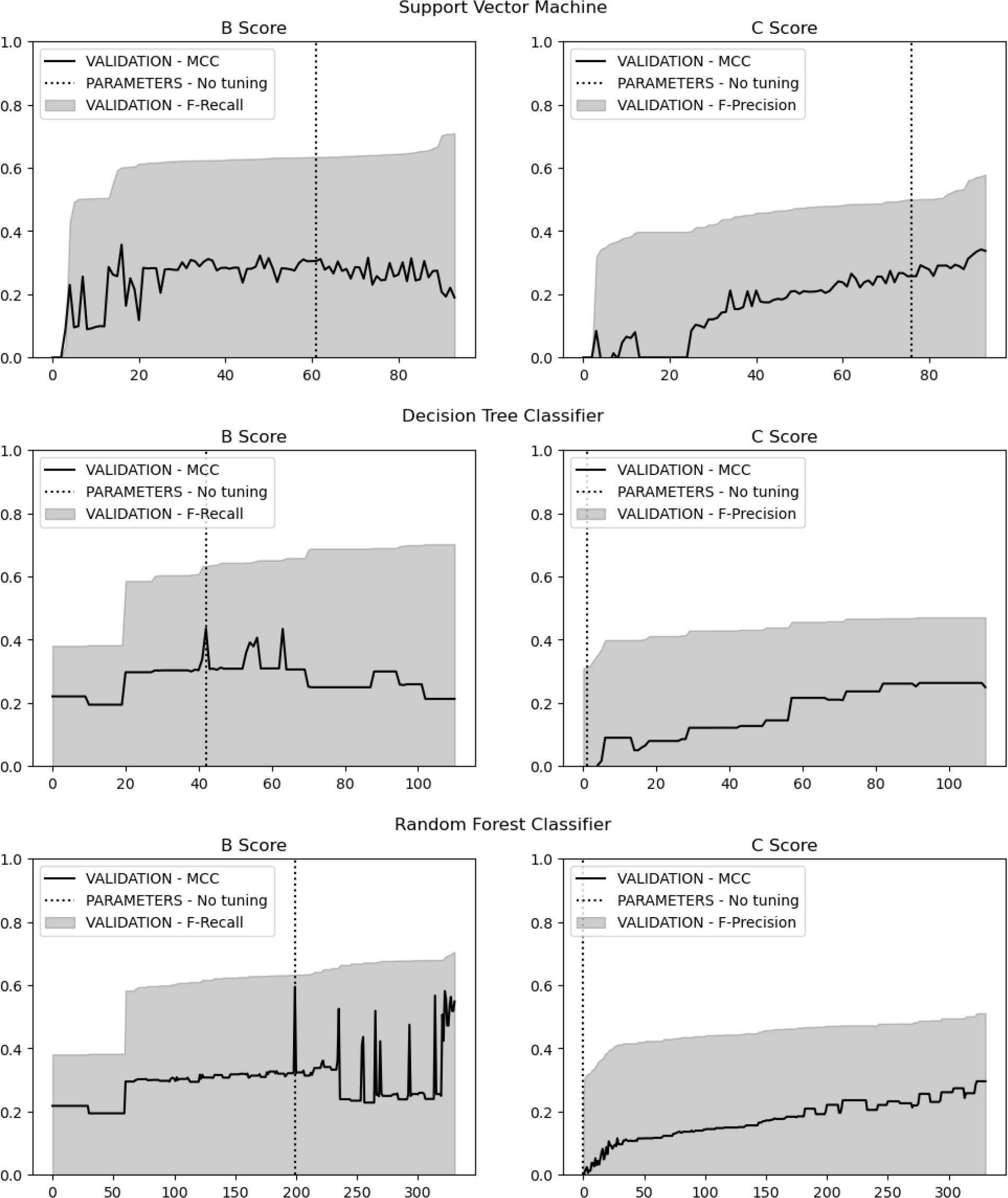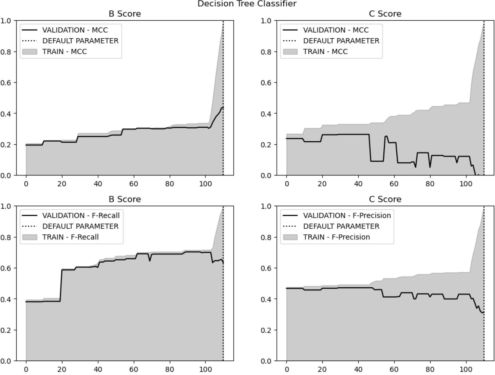 The results in RF and DT are quite consistent with each other in terms of the trends of evaluation criteria for both B Score and C Score. In the case of B Score, the highest MCC achieved on the evaluation set is significantly higher in RF compared to DT. However, when considering F-Recall, the difference between the two models is not significant.