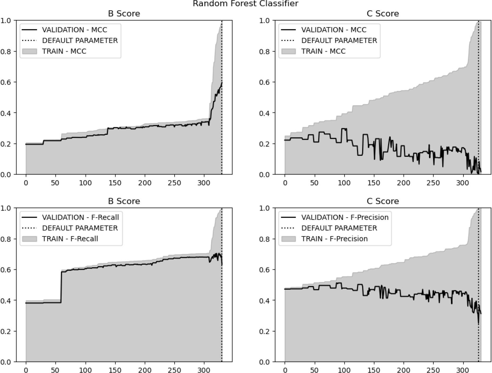 Similarly to the other models, overfitting in RF is not a major issue on the B Score, but it becomes more pronounced on the C Score as the accuracy on the training set decreases the accuracy on the evaluation set. When using the default parameters for the RF models, the results are also similar to the DT models.