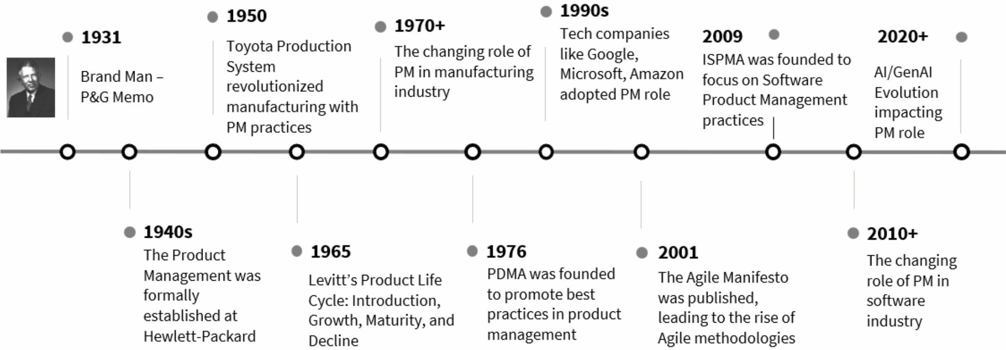The concept of product management has evolved significantly since its inception, adapting to changing market dynamics, technological advancements, and customer needs (Maglyas, et al., 2017). Initially rooted in brand management principles, the product management role has expanded to encompass a diverse set of responsibilities, including strategic planning, market analysis, customer insights, and technological integration (McDaniel and Gray, 1980; Maglyas, et al., 2013). This evolution has been particularly pronounced in the software industry, where rapid innovation demands a high degree of agility and data-driven decision-making (Fricker, 2012). Today, product managers (PMs) are not only responsible for a product’s market success, but also for aligning product strategies with broader business goals, responding to customer feedback, and integrating emerging technologies such as artificial intelligence (AI) (Tkalich, et al., 2022). Understanding the historical evolution of the product management role is crucial, as it provides valuable context and insights for navigating the complexities of modern product development and strategic decision-making (Geracie and Eppinger, 2013; Maglyas, et al., 2017). This section reviews the key historical milestones that have shaped product management, tracing its journey from brand management in the early 20th century to the strategic, AI-focused function it has become today.