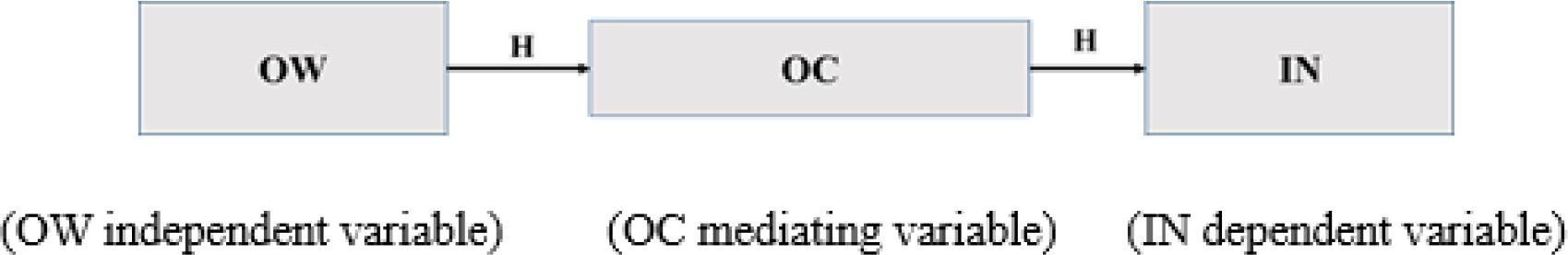 H: OW positively impacts IN and OC by mediating this relationship.