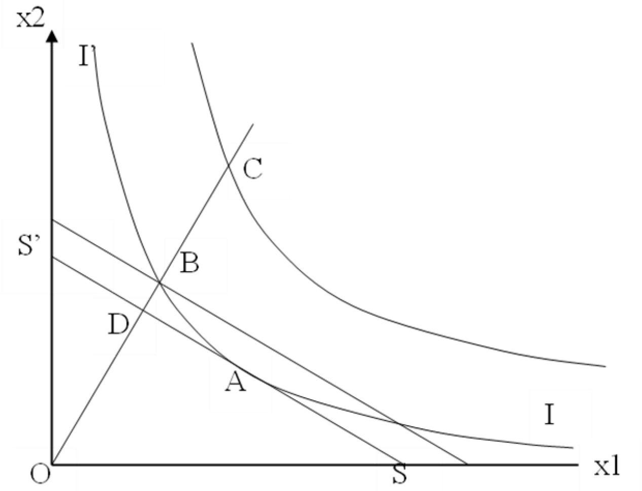 In Figure 1, IAI' is the isoquant curve of a bank, with two inputs x1 and x2. The line SS' represents the toll line. The author further hypothesizes that, in the normal case, banks have a concave production function for the two inputs x1 and x2.