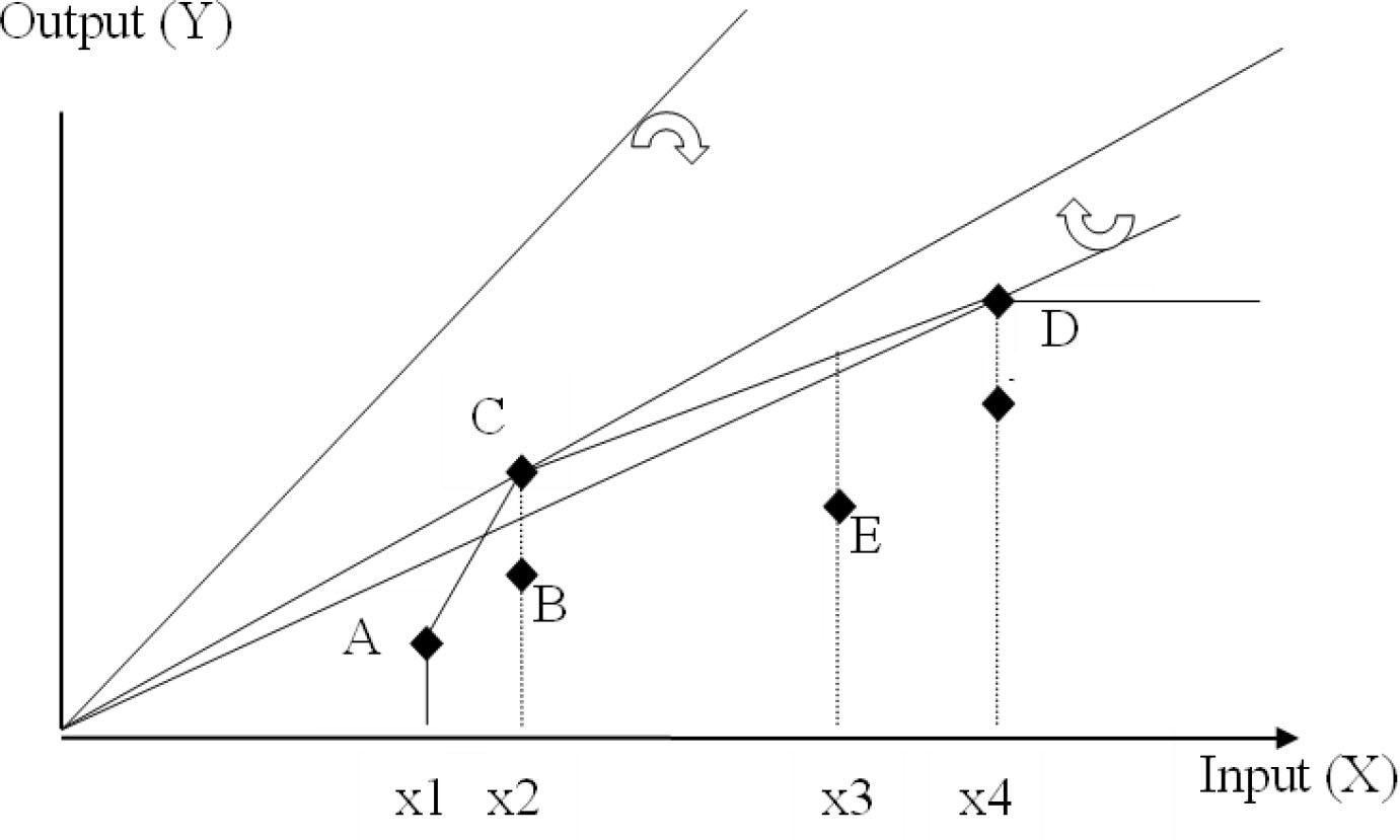 Figure 2 illustrates six points representing six banks with each combination of outputs and inputs at points A, B, C, D, E, and F. In this case, the production frontier is the curve ACD. Points A, C, and D lie on the production frontier, while points B, E, and F lie below this frontier. The line passing through the origin is used to represent the constant efficiency of the banks when the banks lie on this line (then increasing rates of input will lead to an increase in output at the same rate). The line passing through the origin is tangent to the production boundary at point C. The production bank at point C achieves maximum technical efficiency, which also means that it achieves both maximum net technical efficiency and a constant efficiency of scale. In general, points that are both on the production boundary and on the line passing through the origin will ensure maximum technical efficiency. However, a bank that does not achieve maximum technical efficiency may achieve maximum net technical efficiency or maximum scale efficiency. Figure 2 shows that the points A and D are not on the line through the origin but on the production frontier, which means that the banks represented by points A and D are not at the scale of efficiency but achieve the maximum level of net technical efficiency. Points B and F guarantee maximum efficiency of scale because their inputs at x2 and x4 coincide with the inputs of banks C and D, which guarantee maximum net technical efficiency.