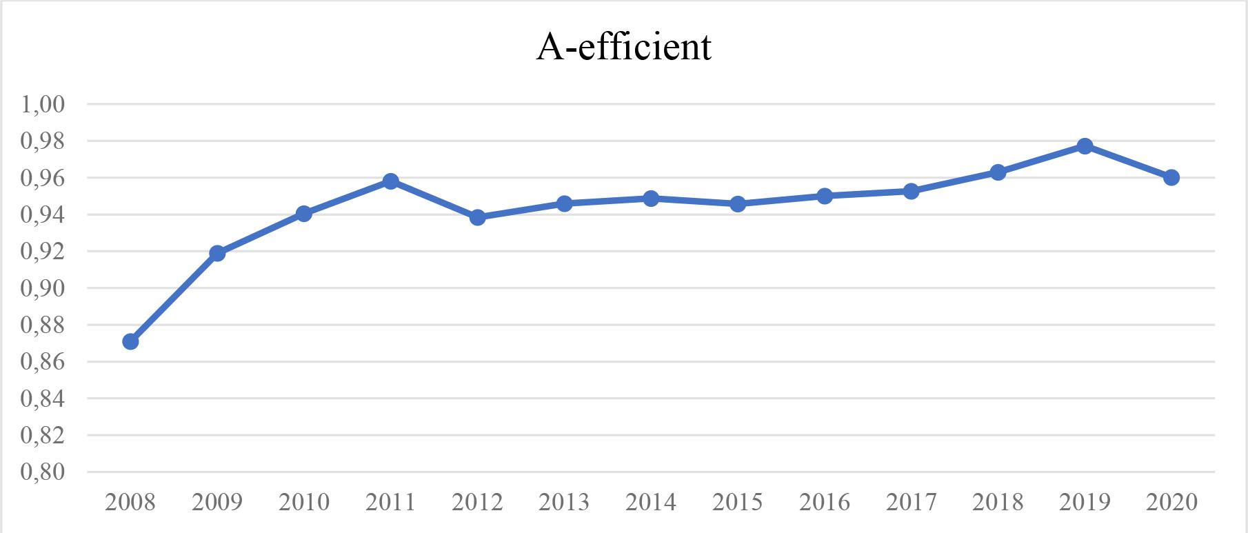According to Figure 3, A-efficiency increased from 2008 to 2011 and then decreased in 2012 due to a series of banks with bad debts. It then increased slightly in the following years, reaching a peak average A-efficiency of 0.98 in 2019, and then decreased in 2020 due to the impact of the Covid-19 epidemic