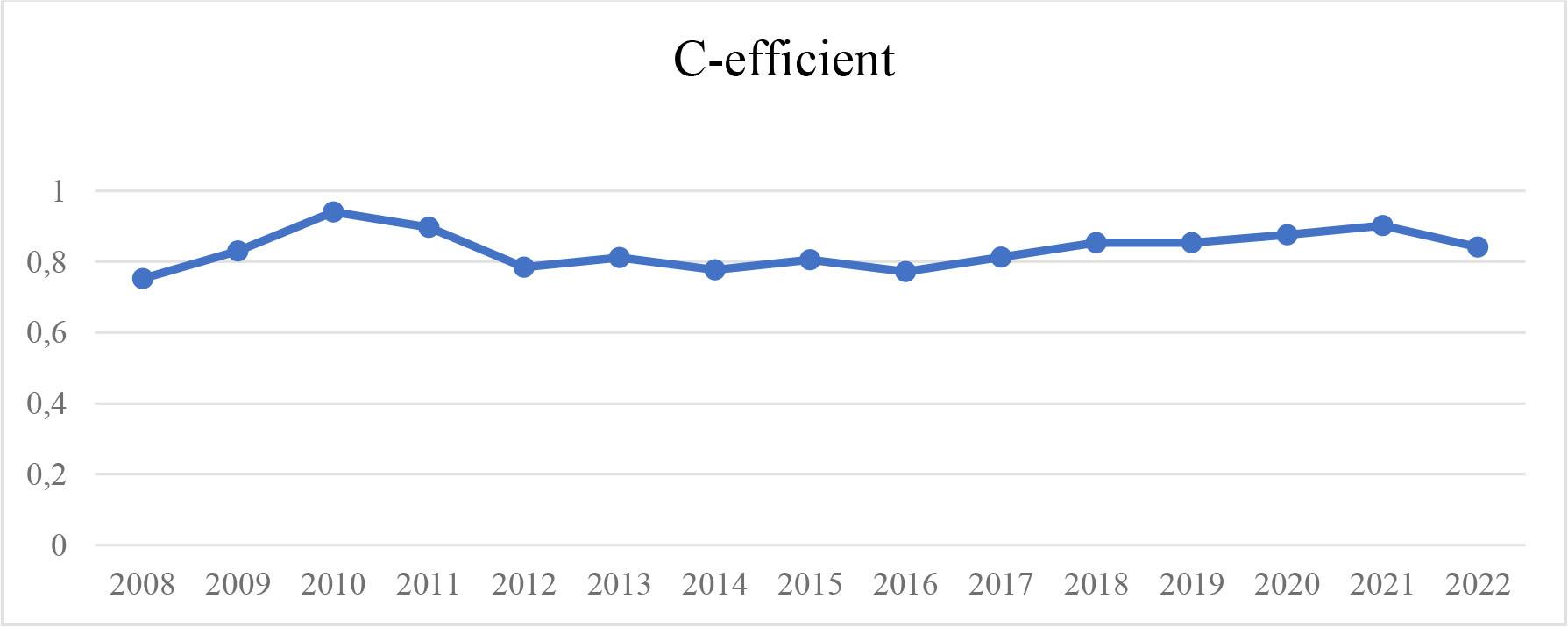 C-efficiency (Fig. 5) peaked in 2010 and declined until 2016 began to recover. This result is quite consistent with the recovery of the Vietnamese economy. The recession started in 2010 and recovered from 2016. The year 2020 was effectively reduced due to the impact of the pandemic.
