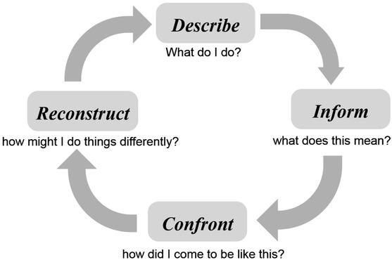 Smyth’s framework11 provides a four-stage process with a key question related to each stage to form a reflective cycle, including describe, inform, confront, and reconstruct.8 The first step is “Describe”, which allows reflectors to narrate a work scenario experienced previously, recalling all the constraints of the situation. The next step, “Inform”, involves unpacking the practice incidents, beginning to think about the assumptions that underpin taken-for-granted actions – “the structured silences” that are presented in nursing – and searching for meaning in the relevant literature. Next, “Confront” involves the following: subjecting the deeply held assumptions and cultural norms about nursing to scrutiny and questioning; uncovering the dynamics of power in relationships; critically questioning implicit economic, historical, political, social, cultural, and personal constraints; and linking the exploration to a review of the empirical evidence. The final step in the process, “Reconstruction”, aims to put the scene together again, but now with transformative strategies for bringing changes based on the new understandings and perceptions gained from critical emancipatory reflection. Overall, the application of theoretical perspectives and empirical evidence is vital, especially in the “Inform” and “Confront” stages of Smyth’s cycle, because meaningful engagement with the literature will facilitate transformative learning.