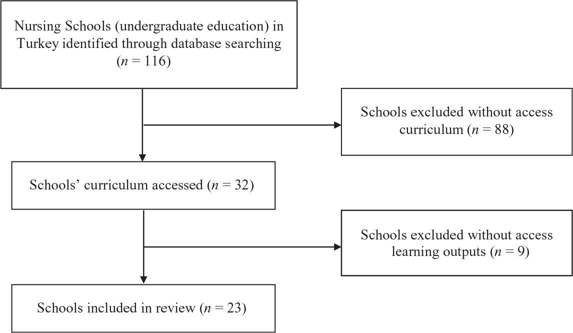 In Turkey, there were 116 nursing schools, and all of them were evaluated for their 2016–2017 Education–Academic year curriculum and learning outcomes. Thirty-two schools’ 2016–2017 Education–Academic year curriculums were accessed. Twenty-three schools’ learning outcomes were created the data of the research. The flowchart of the selection criteria for schools in the study is shown in Figure 1.