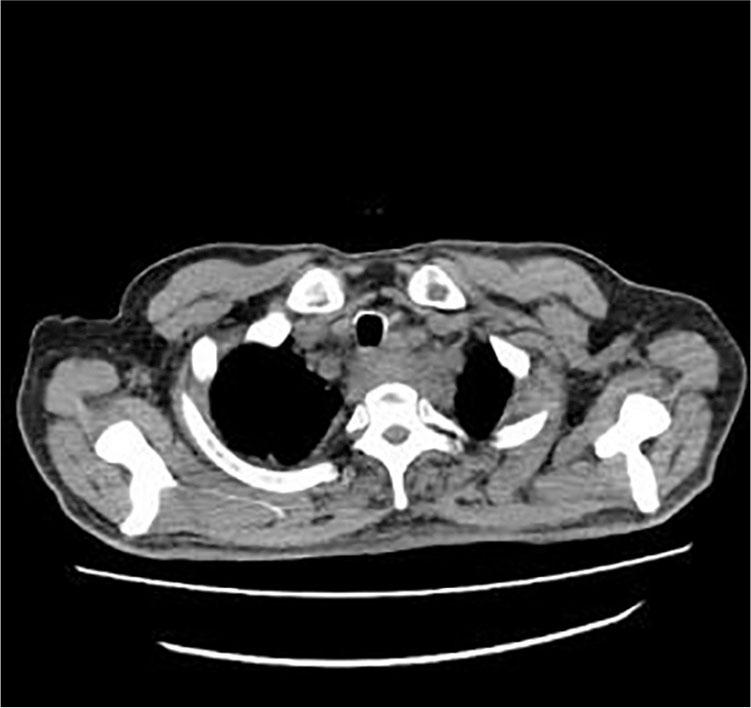 On September 23, 2016, a 56-year-old man consulted the emergency department for 7 days with unknown fever. The highest temperature was 38.5°C. Blood tests were as follows: WBC 7.75 × 109/L, NEUT 76.94%, CRP 120.57 mg/L, and procalcitonin 0.325 ng/ml. Posterior superior mediastinal masses with thickened adjacent esophagus wall and bilateral pleural effusion were revealed by thoracic computed tomography (CT) scan (Figure 1). A 1.0 cm × 2.0 cm protuberant mass was found in the left wall of the esophagus at 20 cm from the incisors by the gastric endoscopy (Figure 2). Endoscopic biopsy shows a chronic active inflammation with ulcer and granulation tissue proliferation. Examine the medical history in detail at that moment, the patient was diagnosed with an odynophagia and admitted that he had accidentally swallowed a fishbone 2 months ago. Taken together, the patient was diagnosed with secondary mediastinitis due to esophagus perforation caused by the ingestion of fishbone. The patient had been treated moxifloxacin intravenously for 15 days, and then he was discharged without fever. Obvious back pain and decreased muscle strength began on the 7th day after discharge. On November 10, he had a Magnetic resonance (MR) of the thoracic vertebra, and the result was C7/T1 centrum infection and paravertebral abscess (Figure 3). The surgical intervention had been performed 4 days later. Consequently, the back pain disappeared, the muscle strength recovered, and an MR reexamination showed the patient recovered completely (Figure 4).