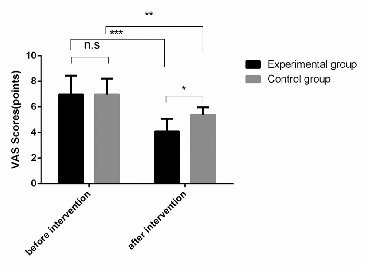 Note: ***There were significant differences in VAS scores in the experimental group before and after intervention (P < 0.001); **There were significant differences in VAS scores in the control group before and after intervention (P < 0.01); *There were significant differences in VAS scores between the two groups after intervention (P < 0.05); VAS, visual analog scale.