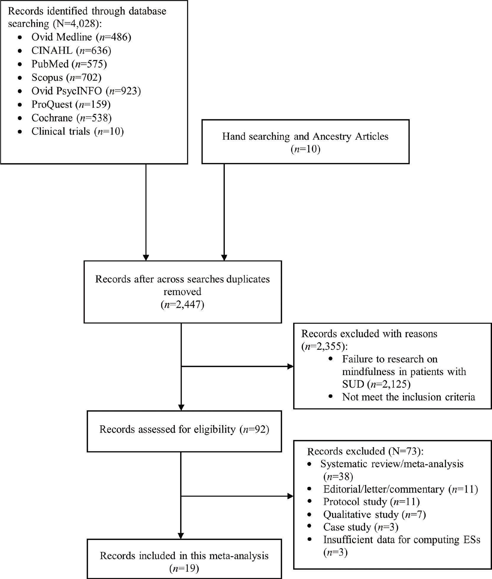 Our searches returned 4028 studies, which were reduced to 2437 studies when duplicates were removed. A total of 10 additional ancestry studies were added. After screening the titles and abstracts of the 2447 studies, 2355 studies that did not meet inclusion criteria were removed. Of the remaining 92 primary studies, we excluded 73 studies for the following reasons: systematic review and meta-analysis (s = 38), editorial/letter/commentary document (s = 11), research without results/protocol (s = 11), qualitative study (s = 7), case study (s = 3), and insufficient information for computing ESs (s = 3). Finally, we retrieved 19 primary studies that met inclusion criteria (s = 19) (Figure 1).