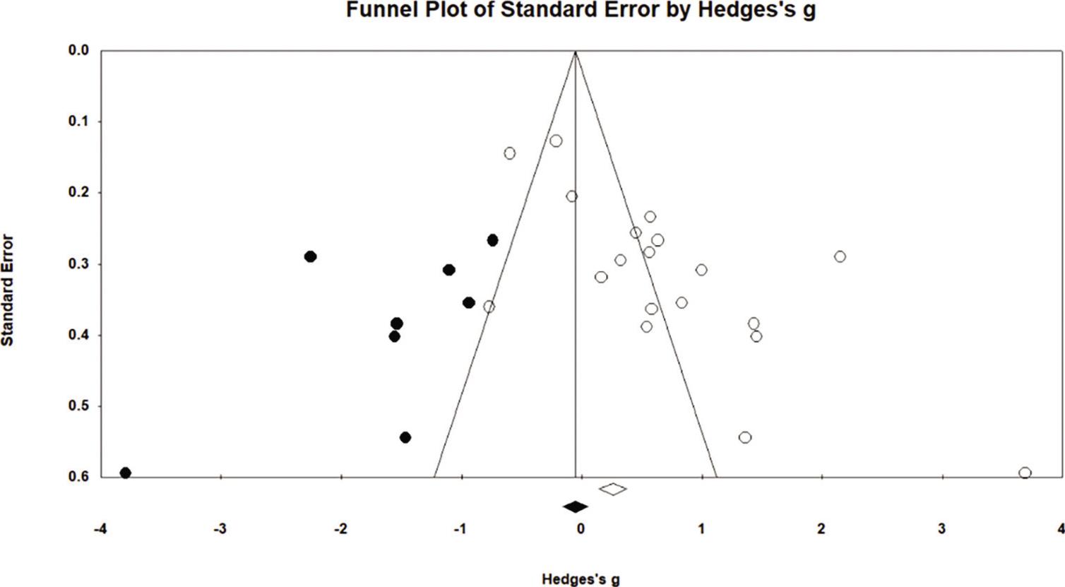 The result of the funnel plot was visually asymmetrical, which suggests the possibility of publication bias26,27 (Figure 3). The Begg and Mazumdar rank correlation test resulted in a Kendall’s tau of 0.391 (P = 0.009), which further suggests the existence of publication bias. In addition, the value of Egger’s regression intercept was 5.66 (95% CI: 2.98, 8.34, P< .001). While the weight of evidence strongly suggests the presence of publication bias, the small number of included primary studies indicates that caution should be used in the interpretation of the potential of publication bias.26,29