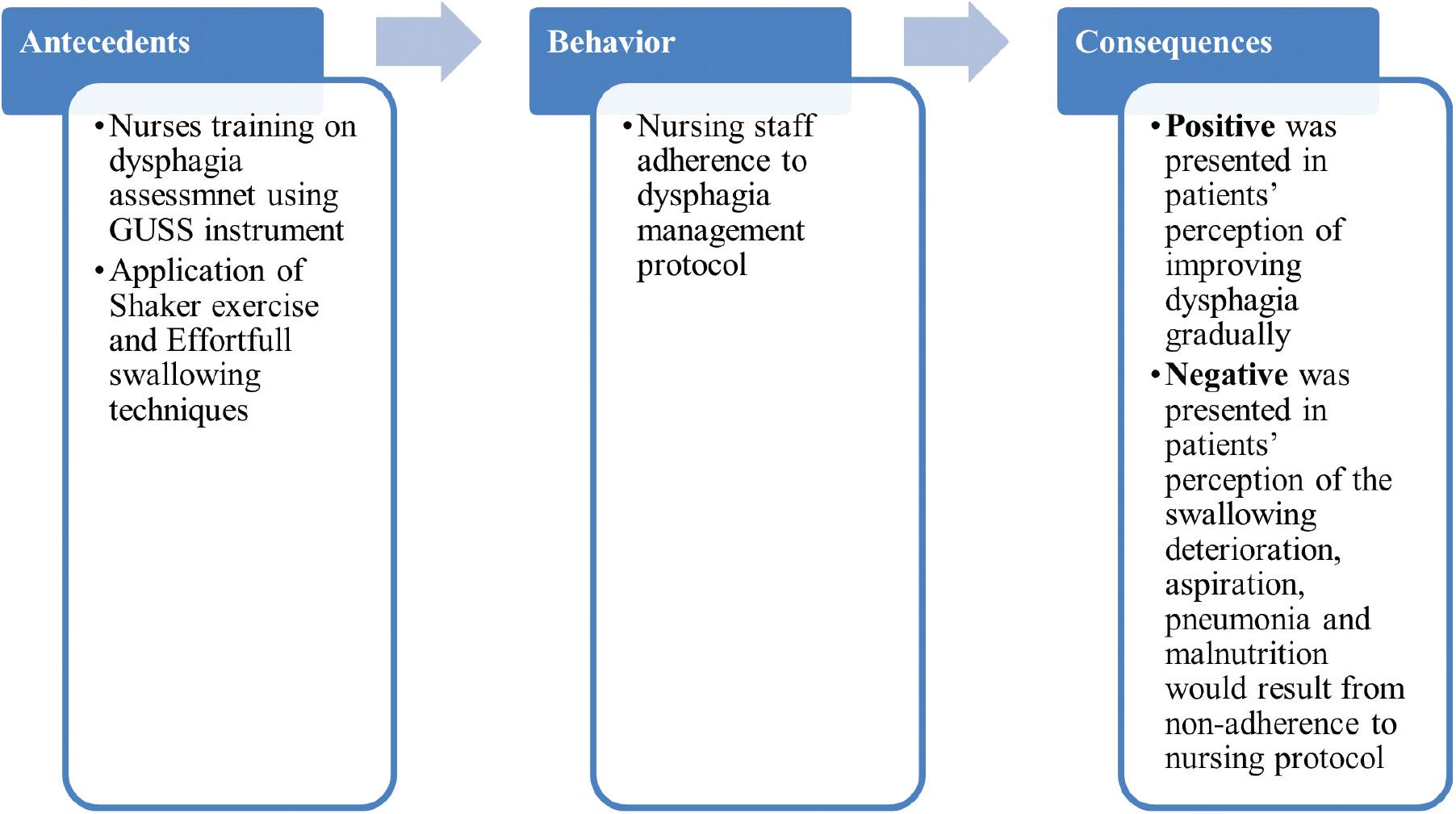 This study was conducted within 15 months, from February 2019 to May 2020. The study group received the nursing intervention protocol and the control group received the usual care. The nursing intervention protocol was designed based on BPM and conducted through 3 phases. Together with being instructed concerning the utility of BPM as the antecedent stimuli that enhances the behavior, nurses were provided training pertaining to dysphagia assessment by using the GUSS instruments and through the application of the Shaker exercise as well as Effortful Swallowing techniques. The nurses’ behavior was assessed in terms of adherence to application of this protocol, as well as their level of cognizance concerning its consequences. The positive was presented in patients’ perception of improving swallowing gradually, and the negative was presented in patients’ perception of deterioration of that swallowing, aspiration pneumonia, and malnutrition, which would result from non-adherence to the nursing protocol.