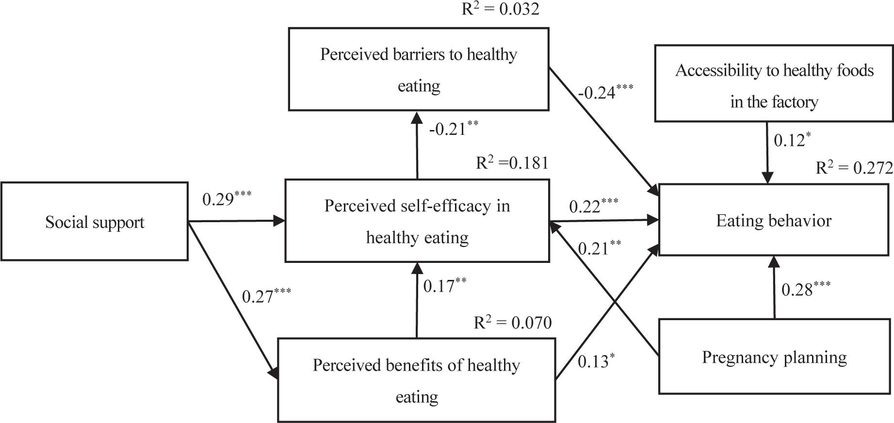 | Variables | Perceived benefits of healthy eating | Perceived self-efficacy in healthy eating | Perceived barriers to healthy eating | Eating behavior | ||||||||