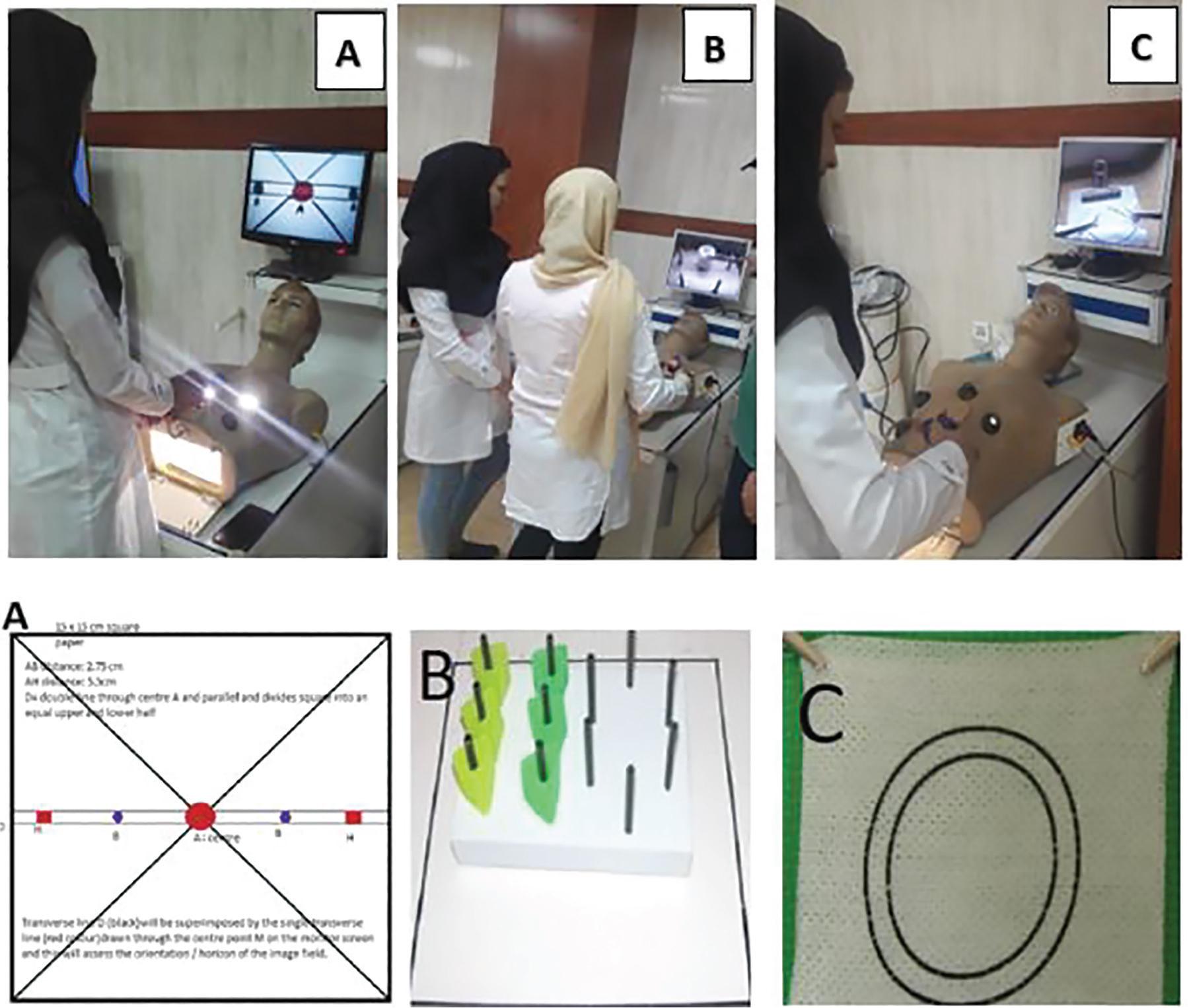 Training and assessing the triple laparoscopic surgery skills in the MISs research center at Rasoul Akram Hospital. (A) camera navigation skill; (B) peg transfer skill; and (C) cutting a circular pattern skill. MISs, minimally invasive surgeries.